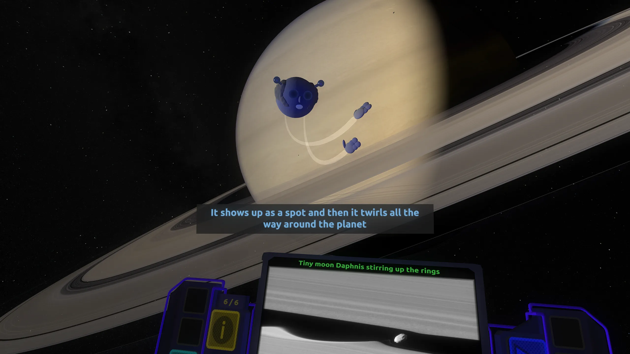 ツアー中は視点を動かせるシーンもあり、惑星に近づくと吸い込まれるような気分に。太陽系の中心から外側への旅はBGMも相まって宇宙空間の孤独感のようなものを感じます。