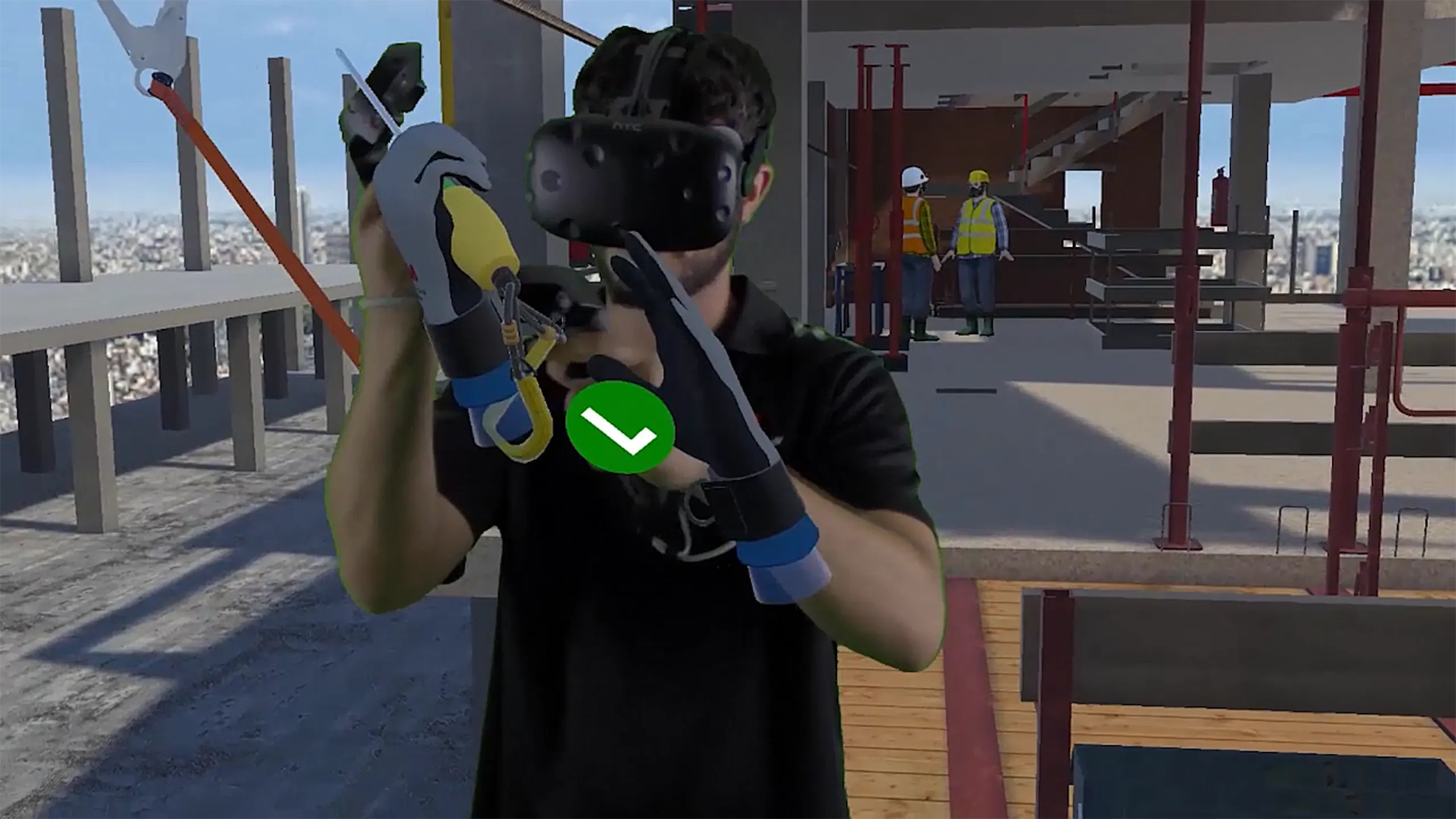 研修生が自ら引きこもるライフラインをつなぎ、道具の高さに落ちないように守る没入感あふれる体験。