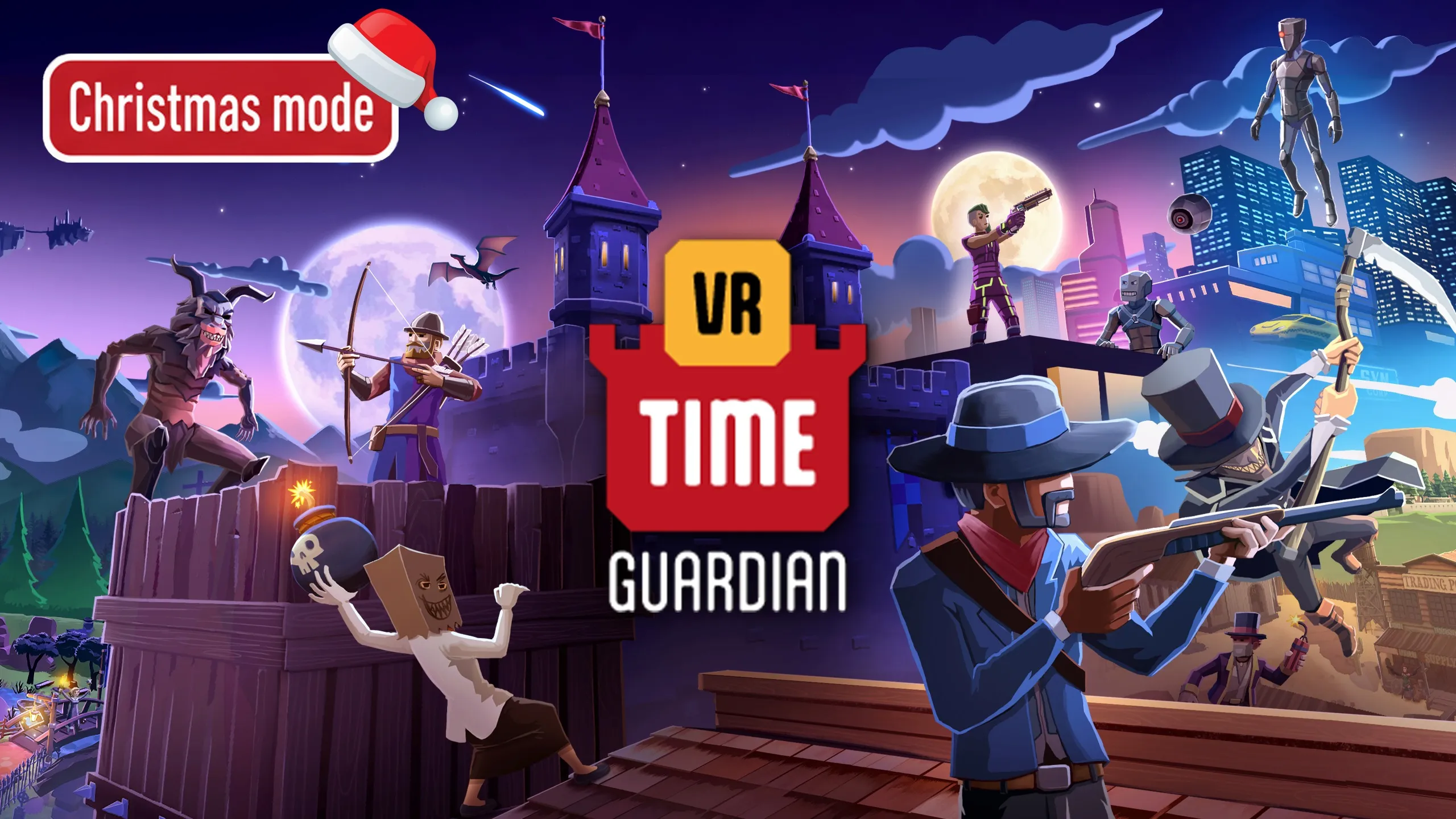 ime Guardian VR の世界に飛び込み、狂気の科学者とその軍勢から貴重な「時の結晶」を守る 時の守護者 となれ。戦いは 3つのユニークな時代 ― 中世、西部開拓時代、そして未来的サイバーパンク ― を舞台に展開。ゲームはテンポが速く、開始直後から没入感抜群。座っても立ってもプレイ可能で、難易度も自由に選べます。起動したら即戦闘 – 複雑な操作や長いチュートリアルは一切なし。