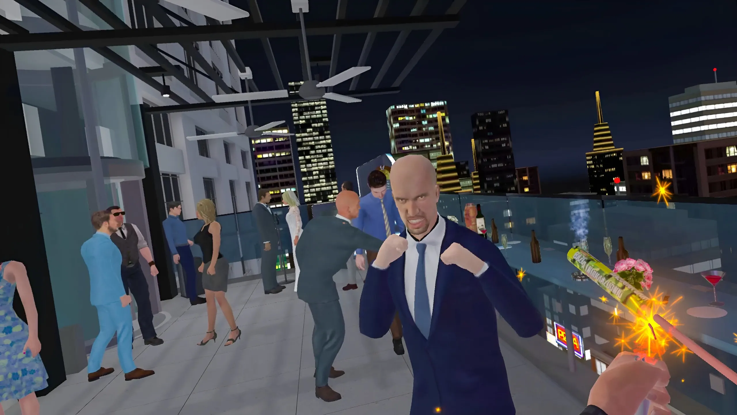 あるいは同じアイテムを使って常連客を床に這いつくばるまで殴り倒し、相手を持ち上げてガラス窓に叩きつけて放り出そう。