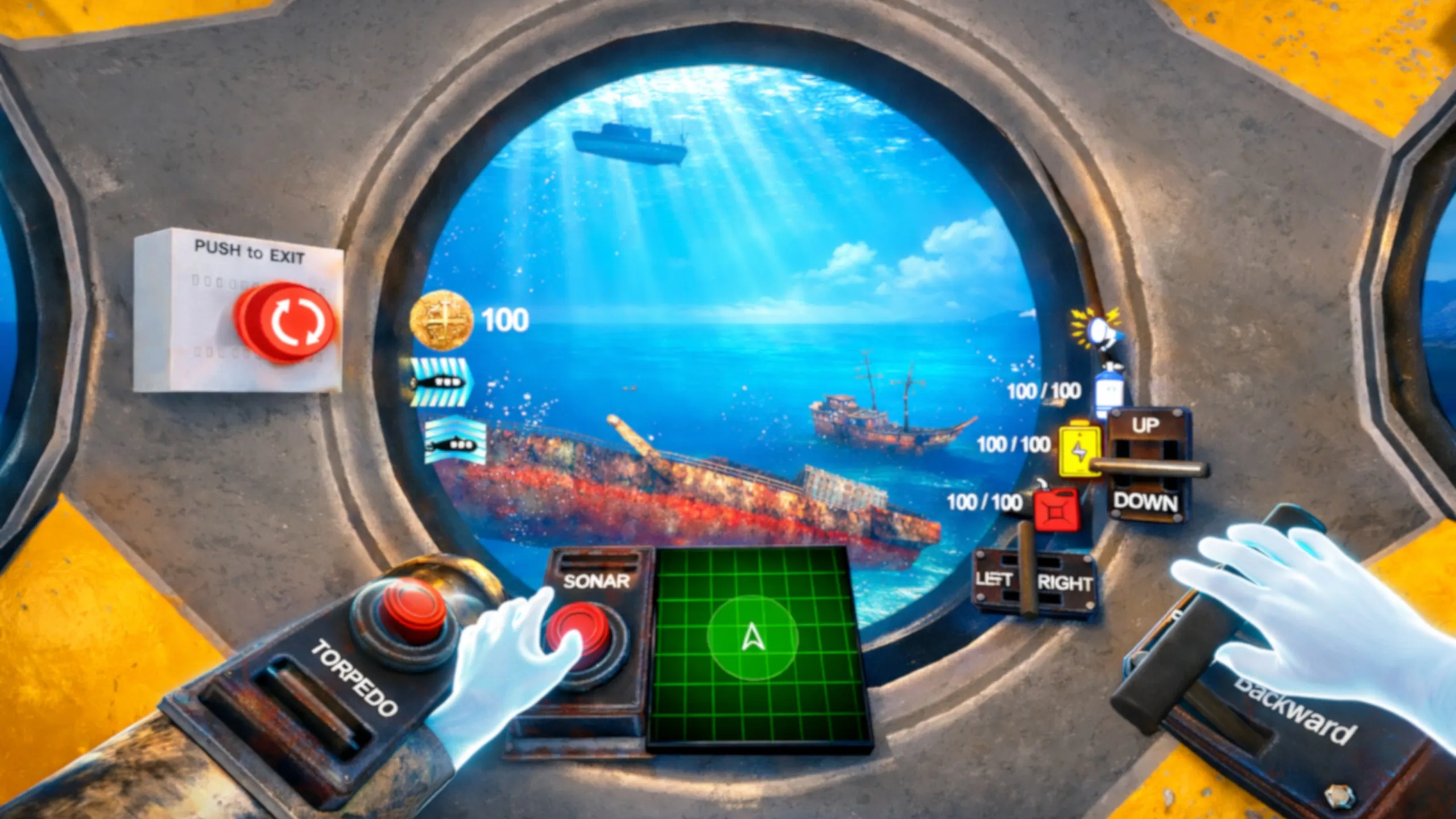 直感的な手のジェスチャーで潜水艦を操縦しよう - コントローラーなしで操縦、加速、操縦しよう。 コックピットの中にいるというリアリズムを感じる。
