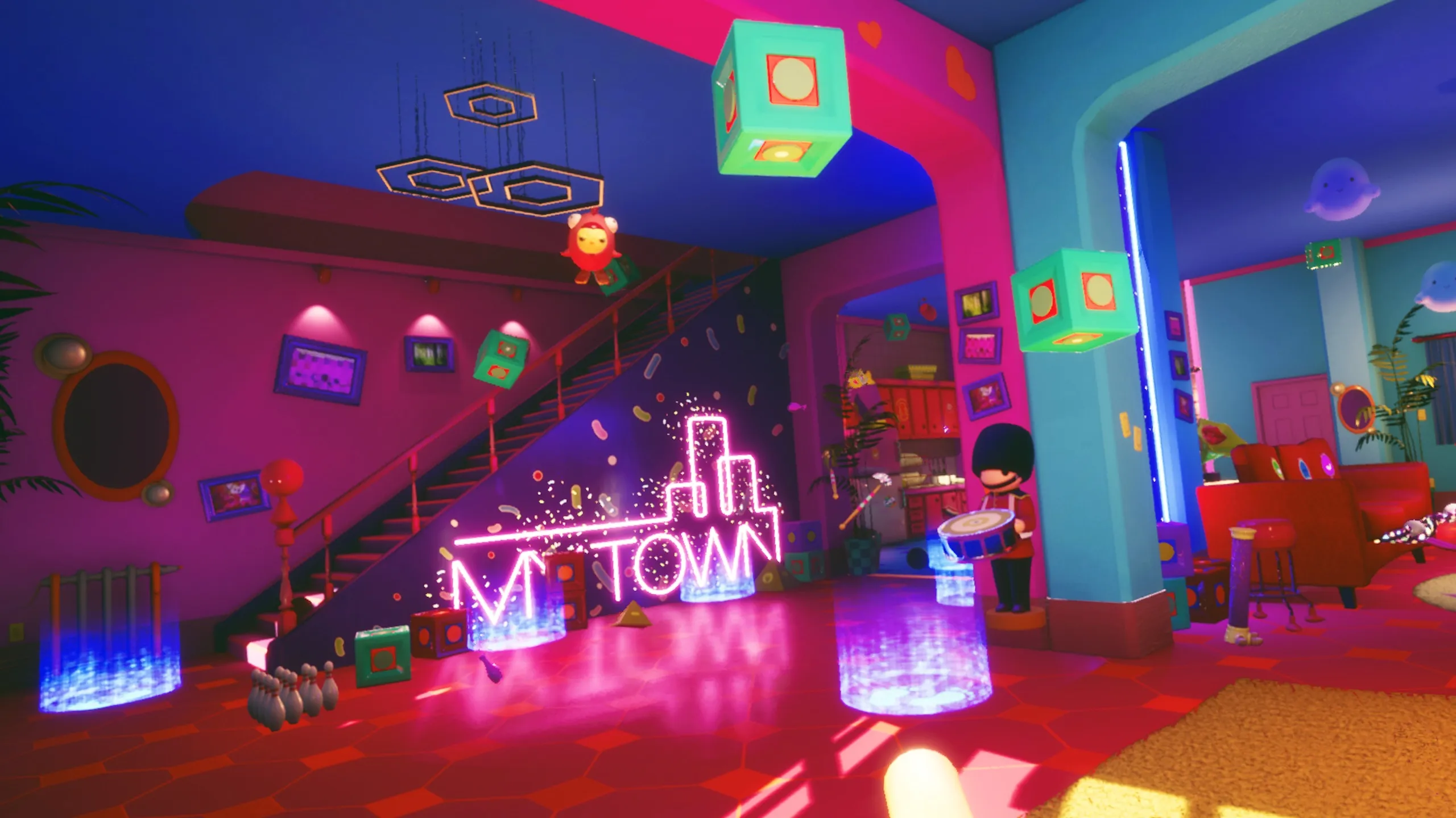 ハロー・マイ・タウンは、弓、シュリケン、または水滴のおもちゃ銃で家に侵入する「ゴースト」を追い払うゲームです。 お化けの他に、ドラム、キシロフォン、野球バット、ボーリングボールなど、家の中の物を自由に拾ったり、投げたり、当てたりする様々な楽しいアクティビティがあります。