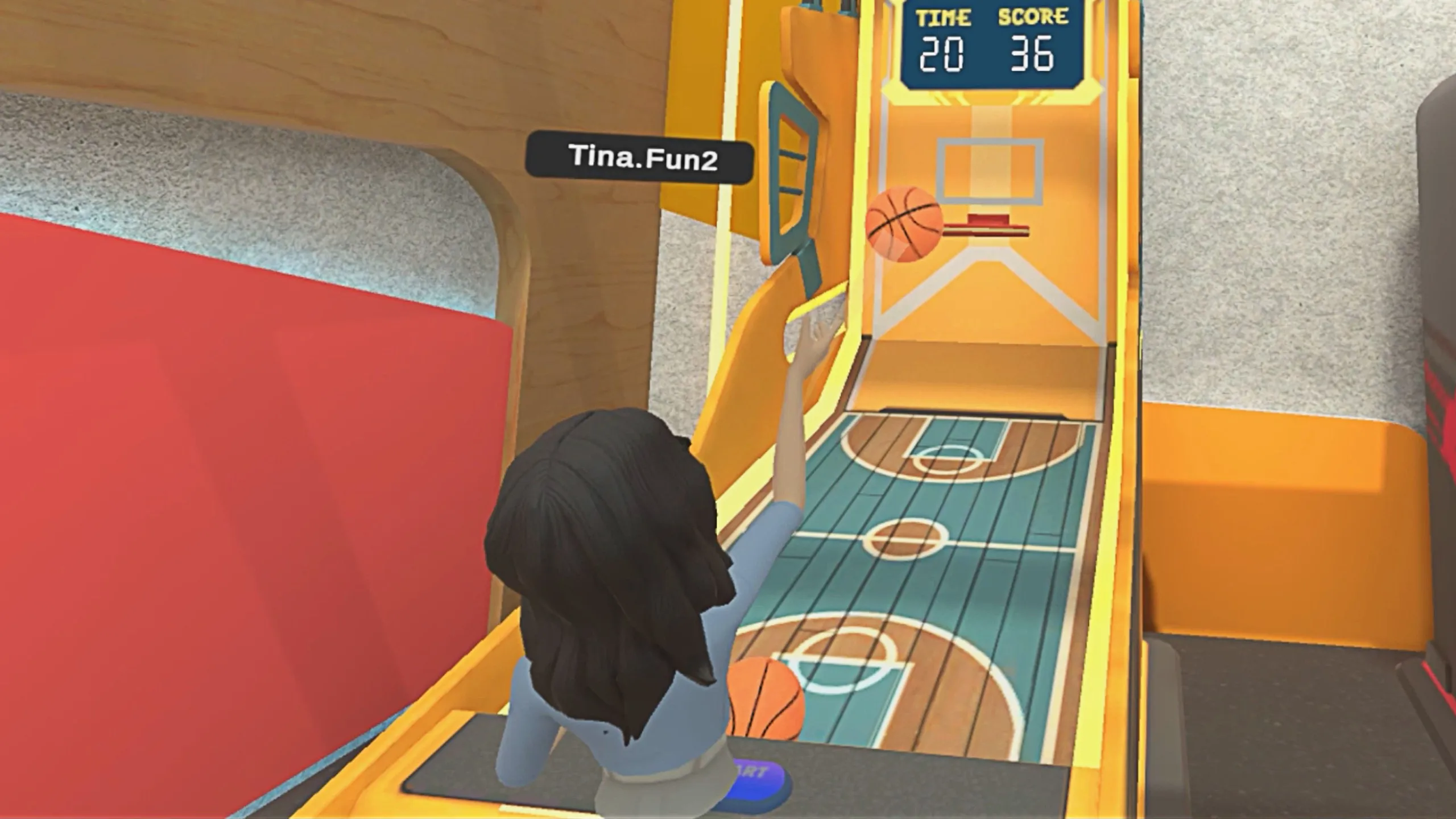 友達とバスケットボールアーケードマシン、野球ピッチングマシンをプレイ
