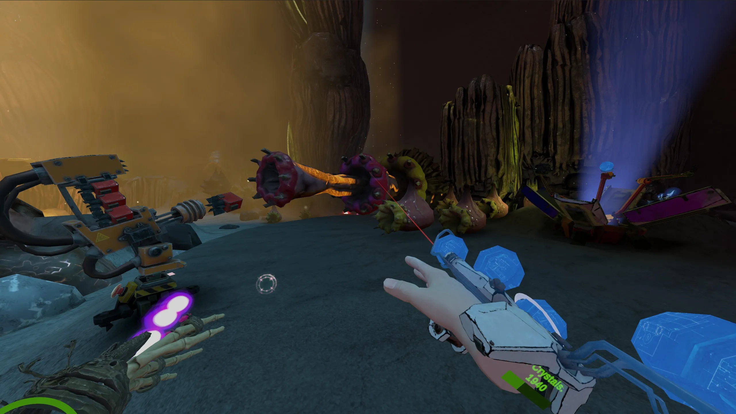 肉の手は背中に青い球体を持っている。 それをもう片方の手で拾って投げると、ハンマーで叩いて構築(もしくは修理)しなければならないタレットを置きます。 それは敵に自動発射するか、引き金を肉手に持ってガイドレーザーを作る。 ベースにあるボタンでそれらを解除することができます。