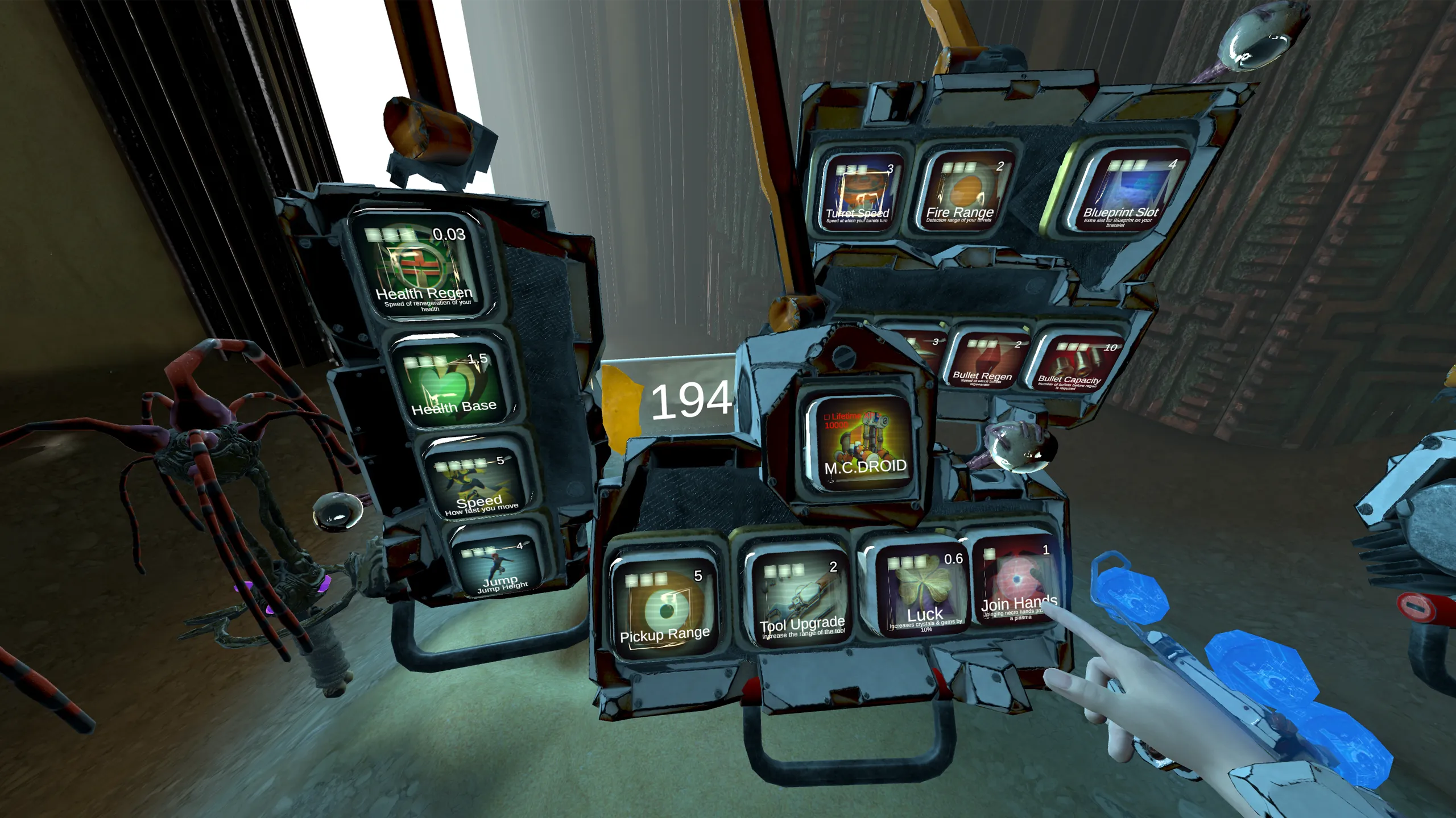 肉の手は背中に青い球体を持っている。 これをもう片方の手で拾って投げると、ハンマーで叩いて構築(もしくは修理)しなければならないタレットを置きます。 それは敵に自動発射するか、引き金を肉手に持ってガイドレーザーを作る。 ベースにあるボタンでそれらを解除することができます。