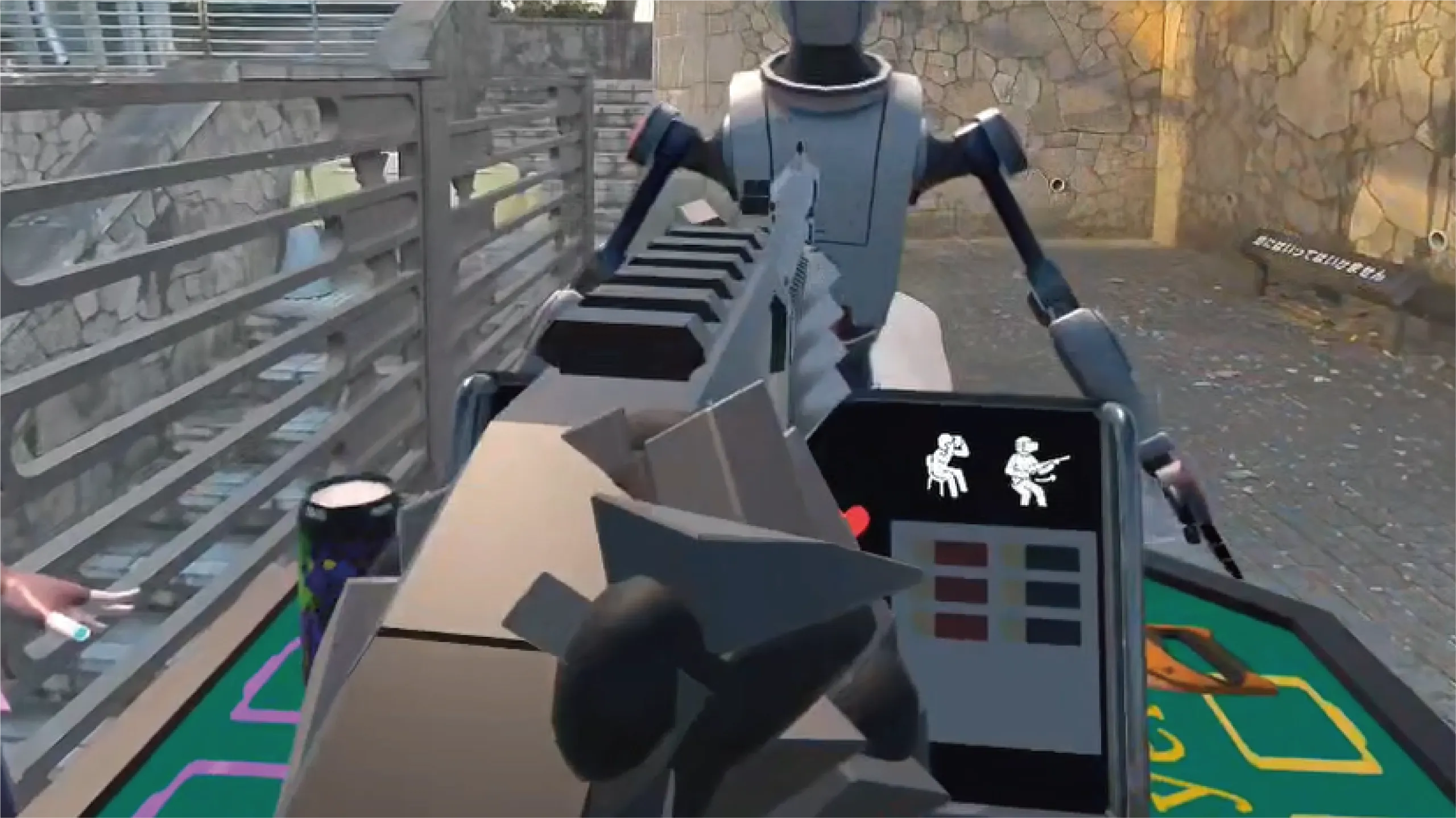 ゲームはラウンド制で進行し、ショットガンを撃つたびにプレイヤーの前へ自動で移動。卓上には “モニターアーム” が配置され、弾数・ターン表示・ヒントなどが視界を邪魔しない位置で確認できます。
