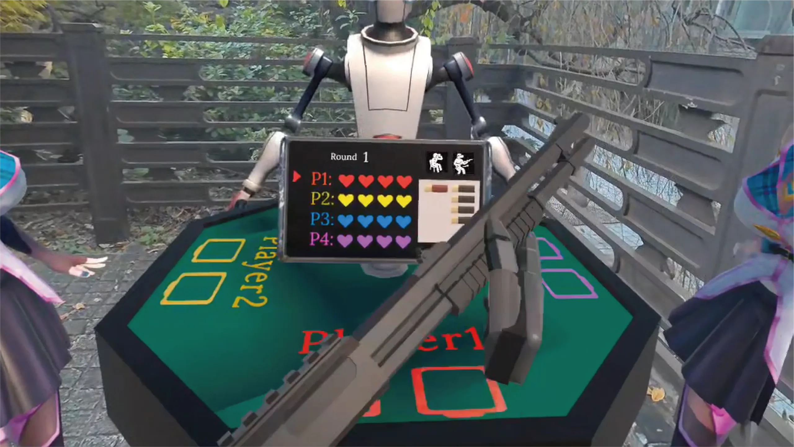 レイヤーは円卓に配置された 4 つの席のいずれかに座り、ランダムに実弾と不発弾が装填されたショットガンを手に取ります。