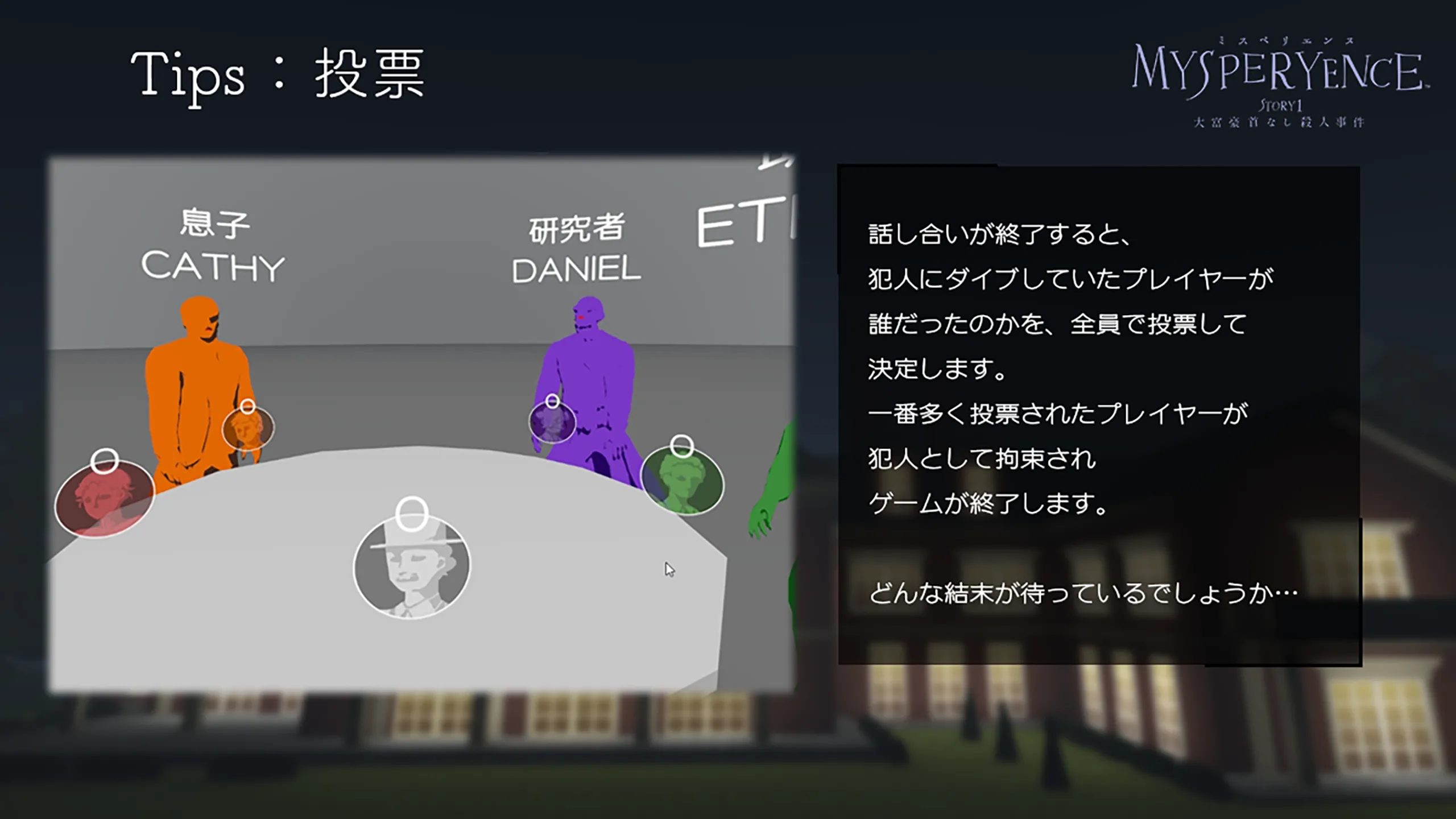 とある洋館で起こった殺人事件を舞台に、プレイヤーはその場に居合わせたキャラクターに乗り移って
