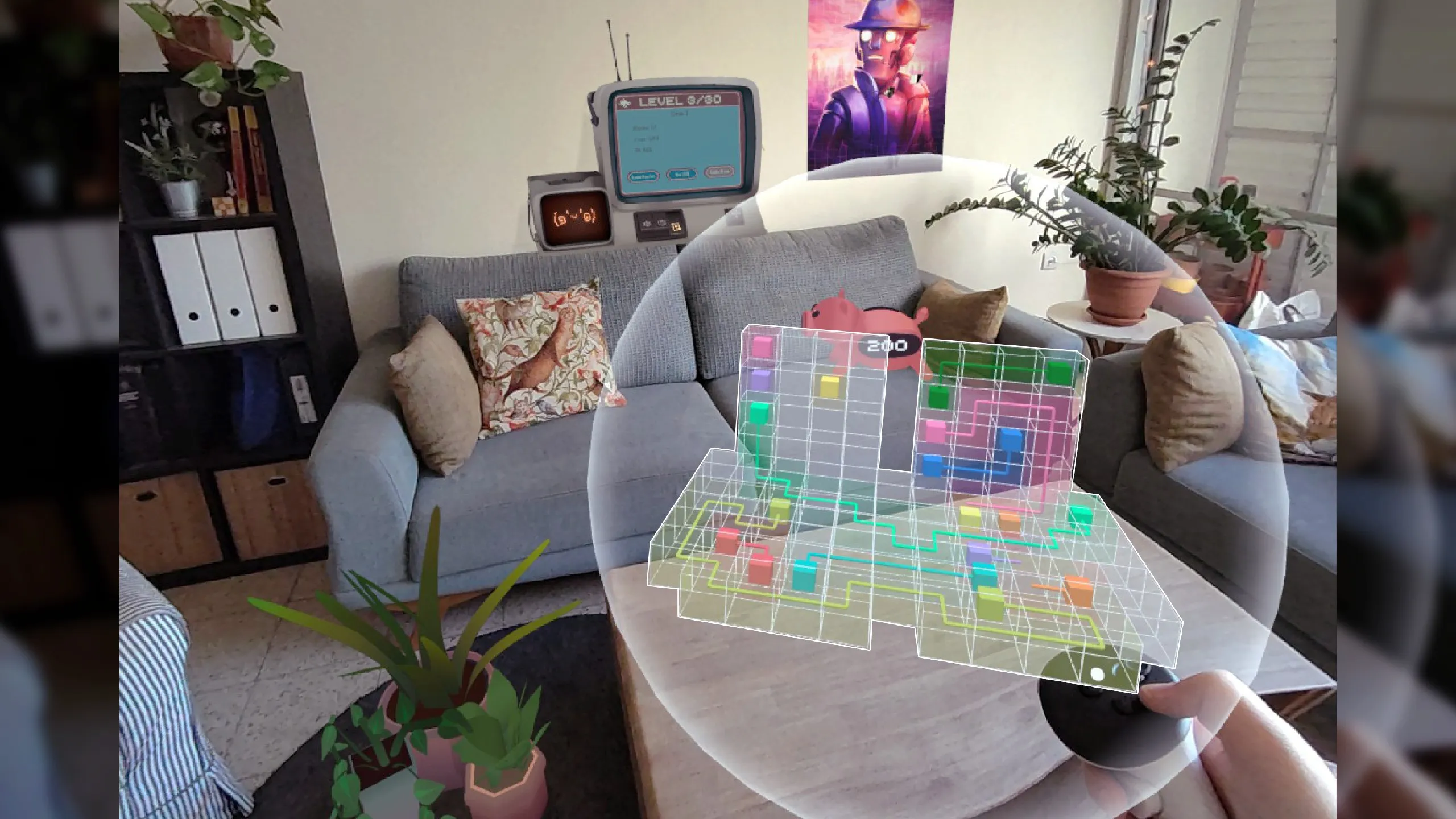 パススルー機能で現実空間にロボットたちを呼び込み、手作りアイテムを集めるパズルゲーム