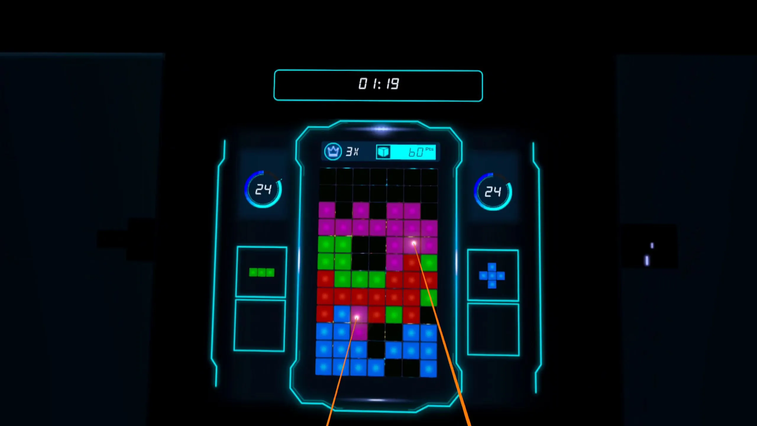 - アーケード:人生の損失を避けるために、時間が切れる前に利用可能なすべての作品を使って異なる色の線を作る(そしてデモ用途でこのモードは1セッションあたり3分間のゲームプレイに限られます)