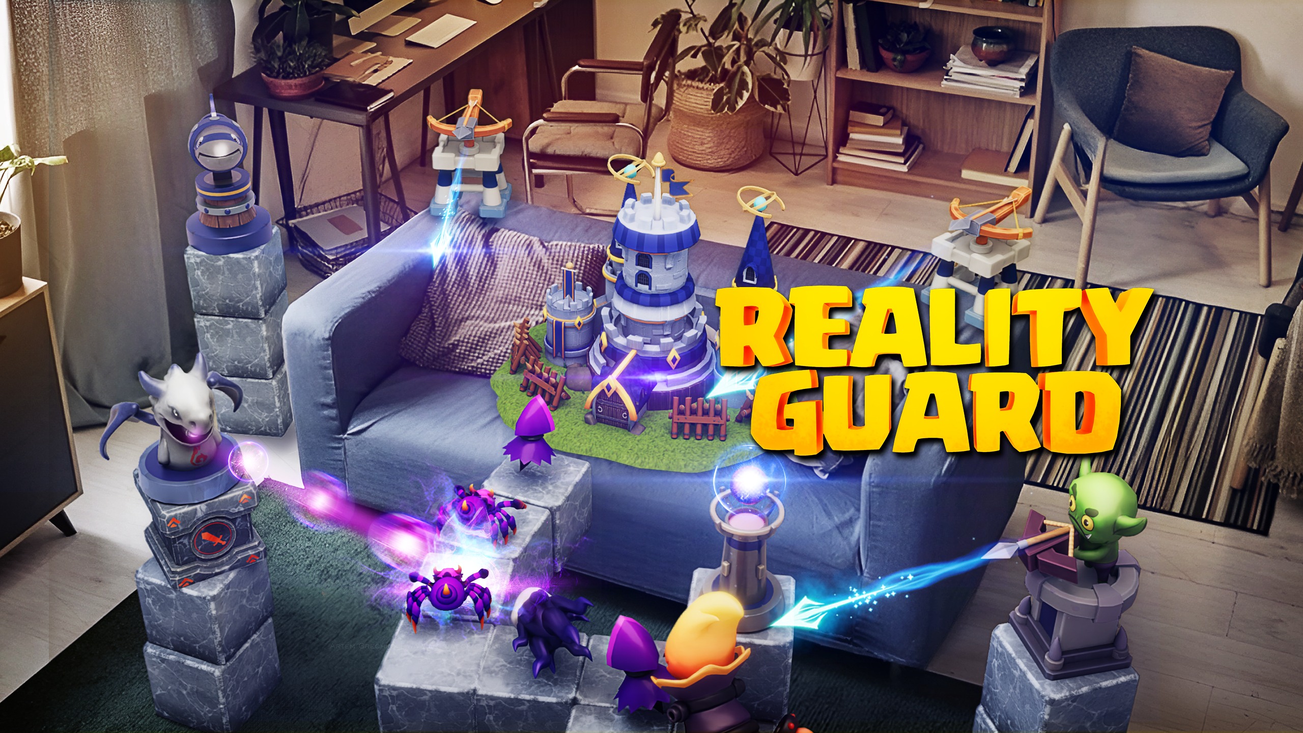 RealityGuardは、あなたのリビングルームを戦場にする印象的なMixed Realitityタワーディフェンス体験です。 大砲、矢印発射器、敵の道にトラップを設置し、ソファー、入り口、または椅子の後ろで編んで行動を維持します。