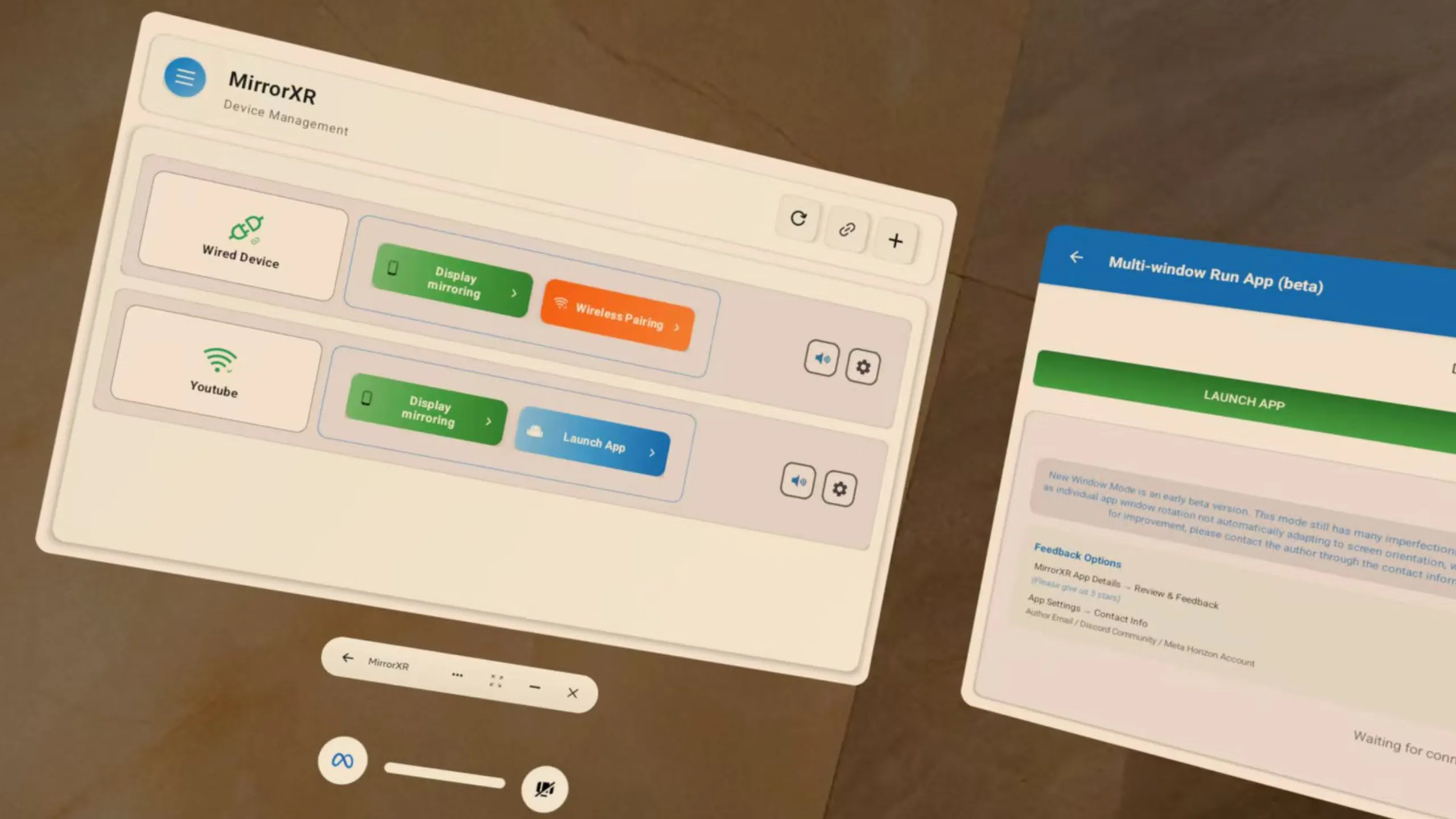 MirrorXRは、高解像度の周囲確認でリアルタイムスクリーンミラーリングとシングルアプリキャストの両方をサポートしています。 他のVRアプリケーション/ゲームとともに操作し、投影されたコンテンツに直接タッチコントロールが可能になり、タブレットのようなインタラクティブな体験を実現します。