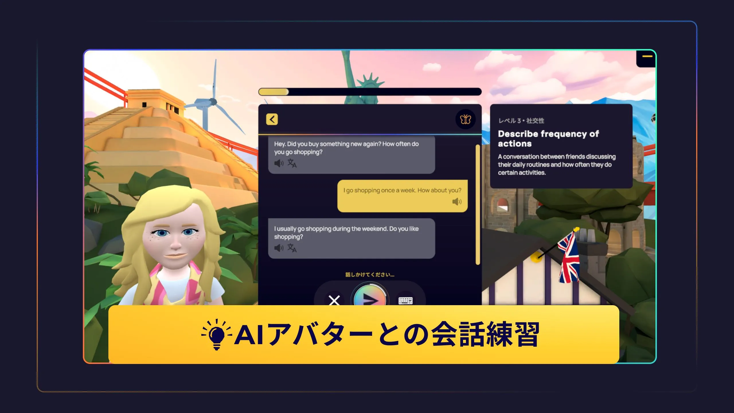 Immerse - バーチャル英会話レッスン & AIスピーキング練習(日本語対応、学習、生産性、旅・探検)のスクリーンショット