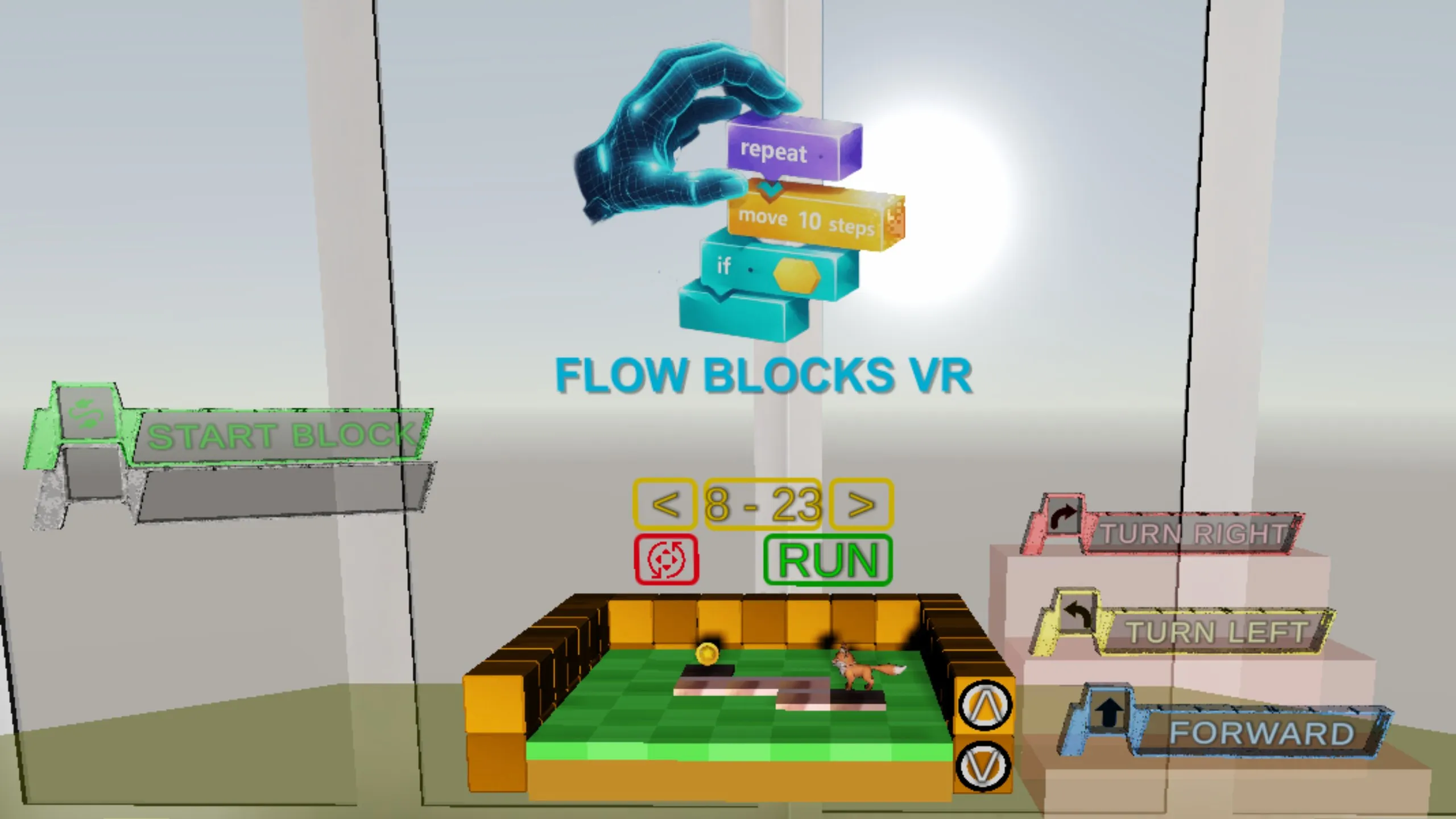 VRの手を使って、プレイヤーはコマンドブロックをつかみ、フローエリアに置き、シーケンスを実行します。 結果は瞬時に表示されます - 成功はキャラクターを前に進め、ミスは再試行や学習を助長します。