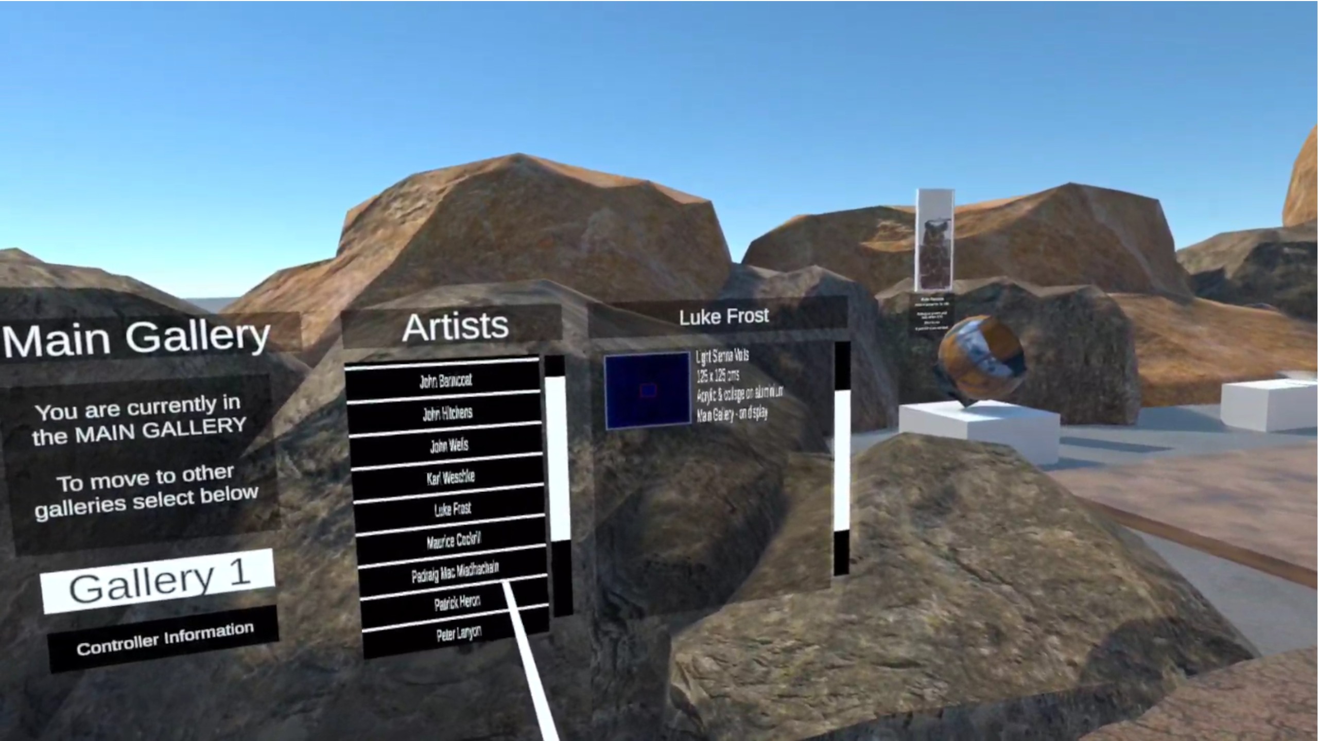 訪問者が壁やスタックからアート作品を選び、アート情報の閲覧、アート関連の動画を見ることができるインタラクティブVRアートギャラリーの例。