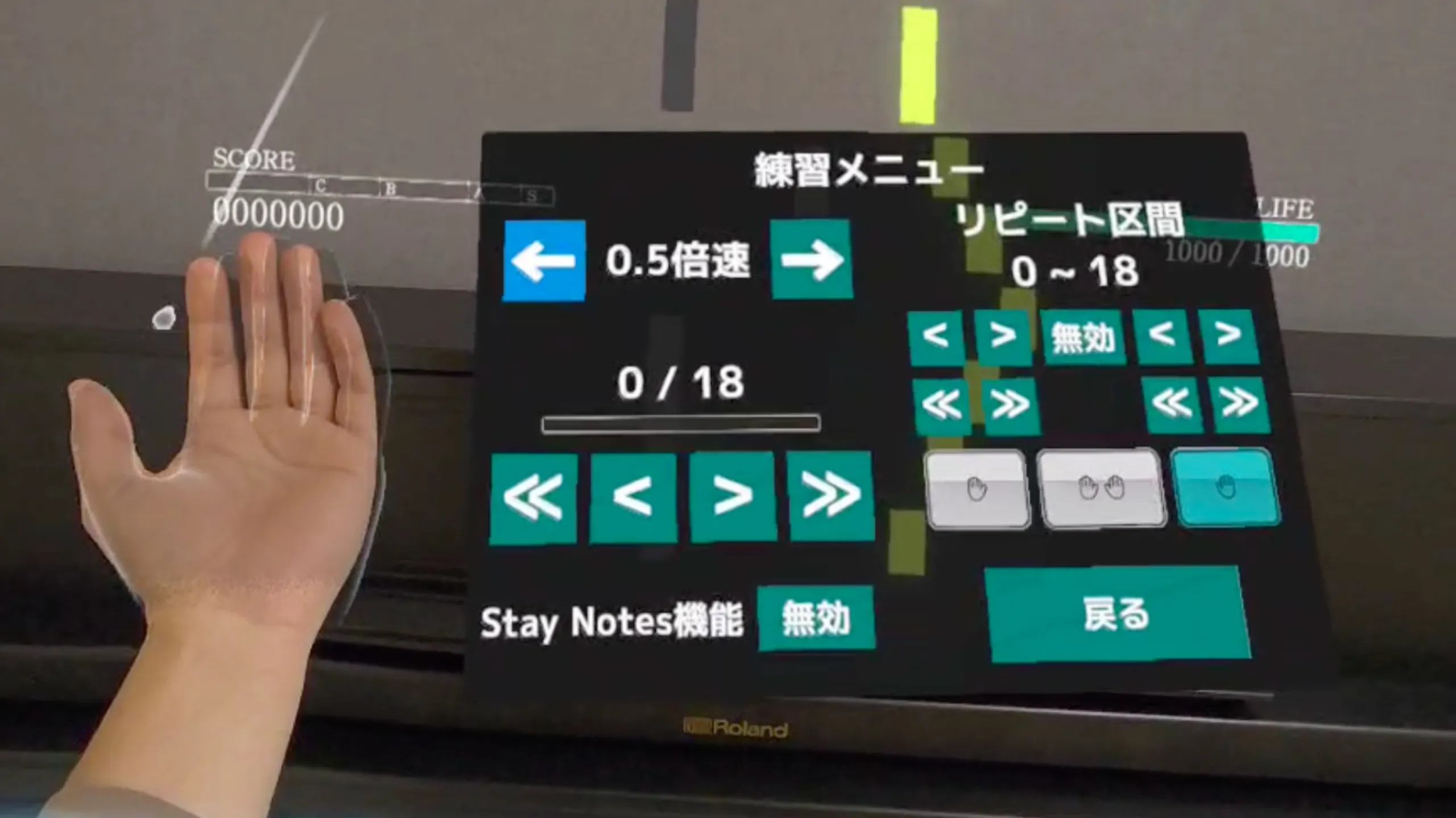 上手く弾けない時は、「練習モード」で自分のペースで練習することができます。