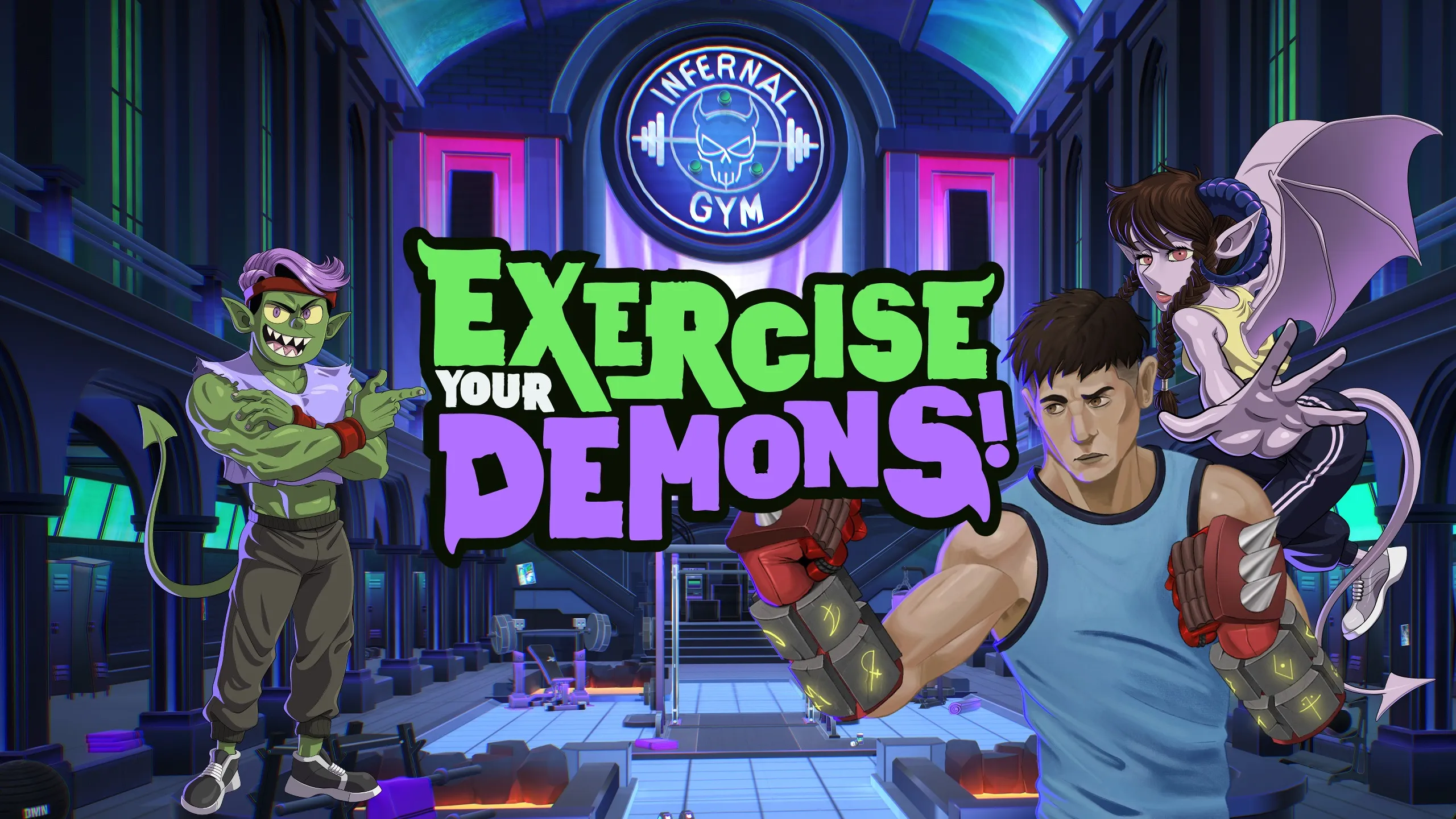 り上がっていこう!エクササイズ・ユア・デーモンズ!で内なる野獣を解き放ち、悪魔の大群と汗の雫を撃退しよう!インファナル・ジムの最高のトレーナーがあなたを完全にサポートし、リビングルームでの戦い方を教えて世界を救おう!