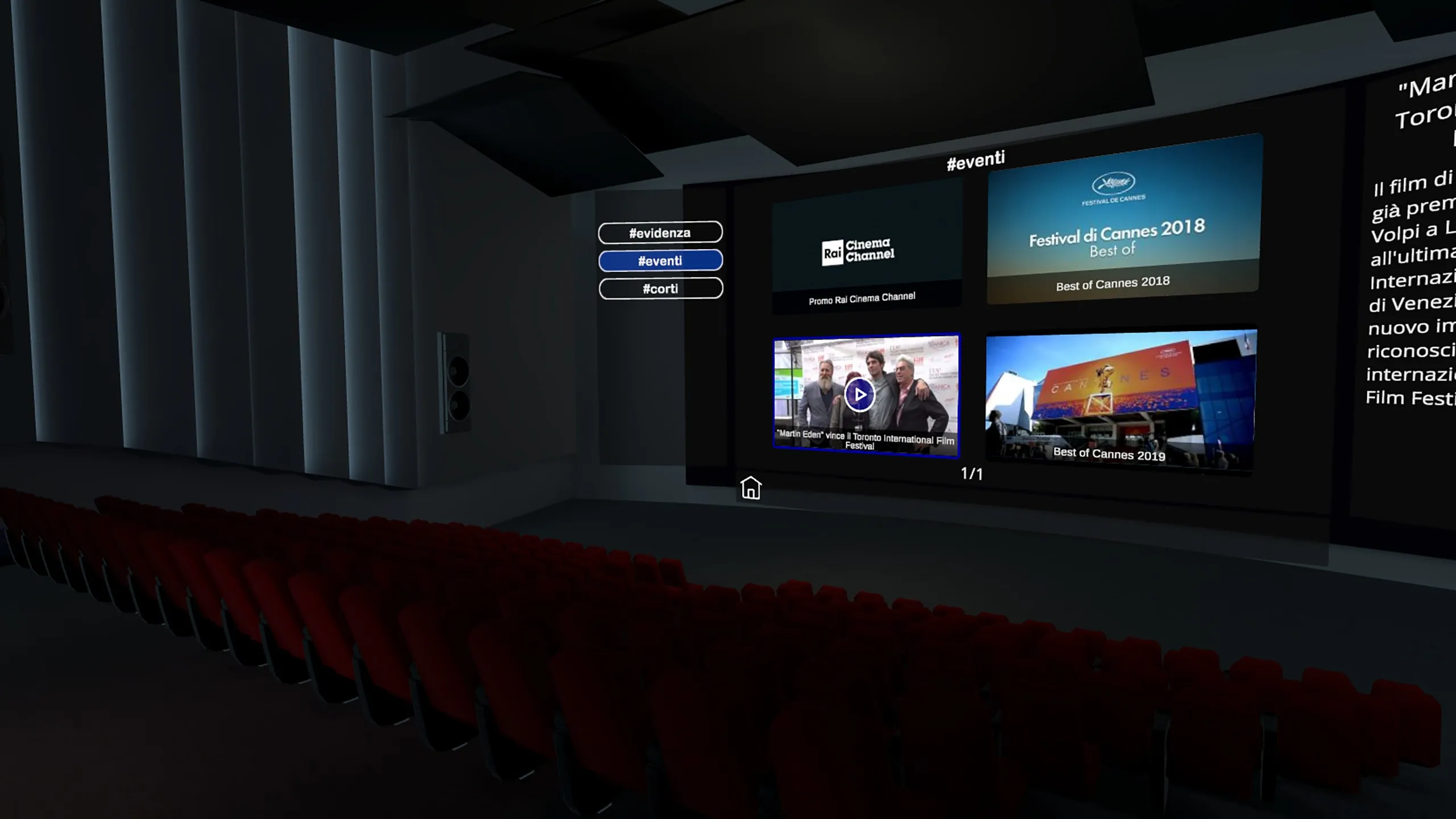 Raiは、バーチャルリアリティで幅広いオリジナルコンテンツを提供するすべてのイタリアのVR APPを立ち上げた最初のメディア企業です。 APPを使用すると、専用リニアや360°VRコンテンツが得られ、Rai Cinemaの「バーチャルシネマ」で映画祭のレッドカーペットに星空を眺め、インタビューを見てVRショーツやドキュメンタリーに没入感を味わえます。 APPをダウンロードしてヘッドセットを装着したら、コントローラーで移動するか、周囲の空間を物理的に歩くかを選択できます。 Foyerではトリノ国立映画博物館の歴史的プロジェクターを3Dで再構築、Rai Cinema賞コーナーやリニア映像や360°VRルームへの入り口など、インタラクティブなポイントをご用意しています。 ポスターを選択すると、選択したコンテンツを表示するためにルームに直接投影されます。 Cinema Room内で線形動画が表示され、VR Roomでは360度動画が表示されます。