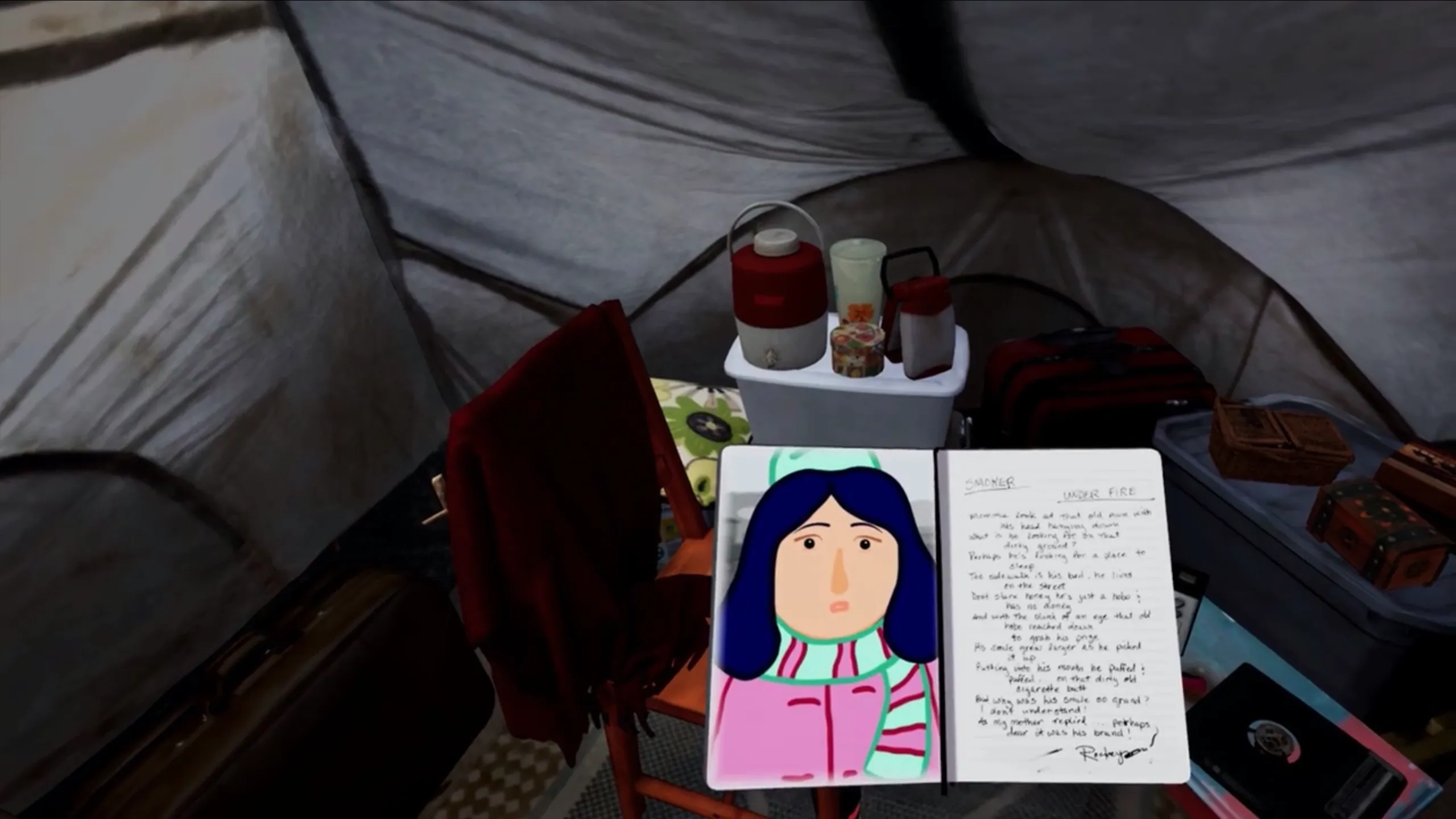 インタラクティビティを通して、ロッキーの個人的な物体、ロッキーの思い出を保持し、彼女の過去を描く物体を探求しよう。 彼女の日記をピックアップしてアニメーションポエムを公開しよう。ロッキーが10歳の時に初めて見たホームレスの男の物語。 ロッキーの写真が詰まった小さな木箱を見つけよう。 オルゴールを鳴らして、ロッキーの家を再び持つという夢を聞こう。 オートバイから小さな切り絵を拾い、ロックがスタージズに向かう途中のオートバイの後ろで結婚した日のことを物語るサイケデリックなアニメーションを開く。 ついに、ロッキーの幼少期の小説がロックの最後の望み-カウボーイになりたいというアニメーションを明らかにする。