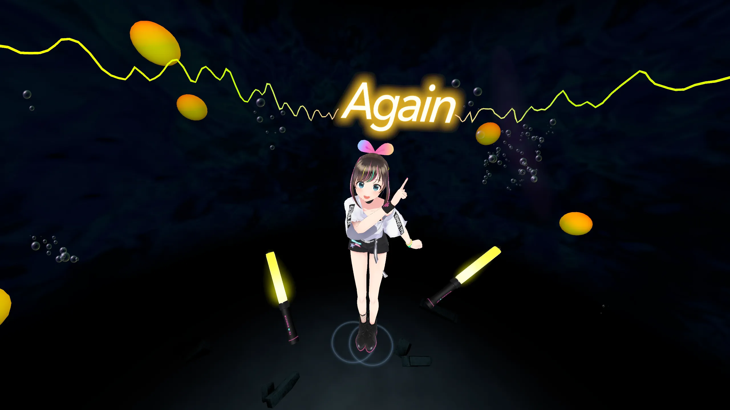 このゲーム内で、あなたはKizuna AIのパフォーマンスステージの観客です。持っているペンライトで飛んで来るノーツをリズムに乗って打ち返しましょう。上手くプレイすればするほど、Kizuna AIのパフォーマンスをより近くで見ることができます。連続コンボを目指しましょう!