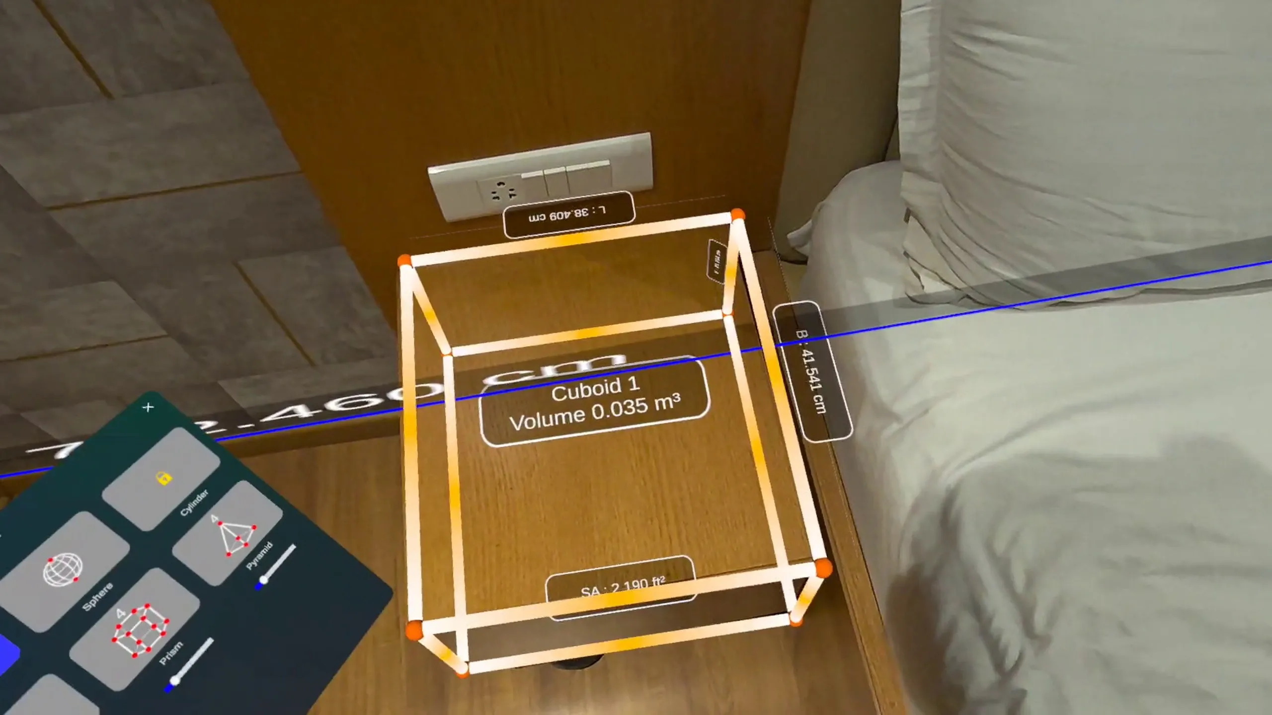 D:レーザーレベル、基本的に空間の天井と床の超薄い長方形として機能する(これは実際には立方形機能を使用して可能ですが、ほぼきれいではありません。理想的には空間で検出された壁と平行するべきです&これはヒモングです Meta独自のレイアウトアプリの機会を逃した。
