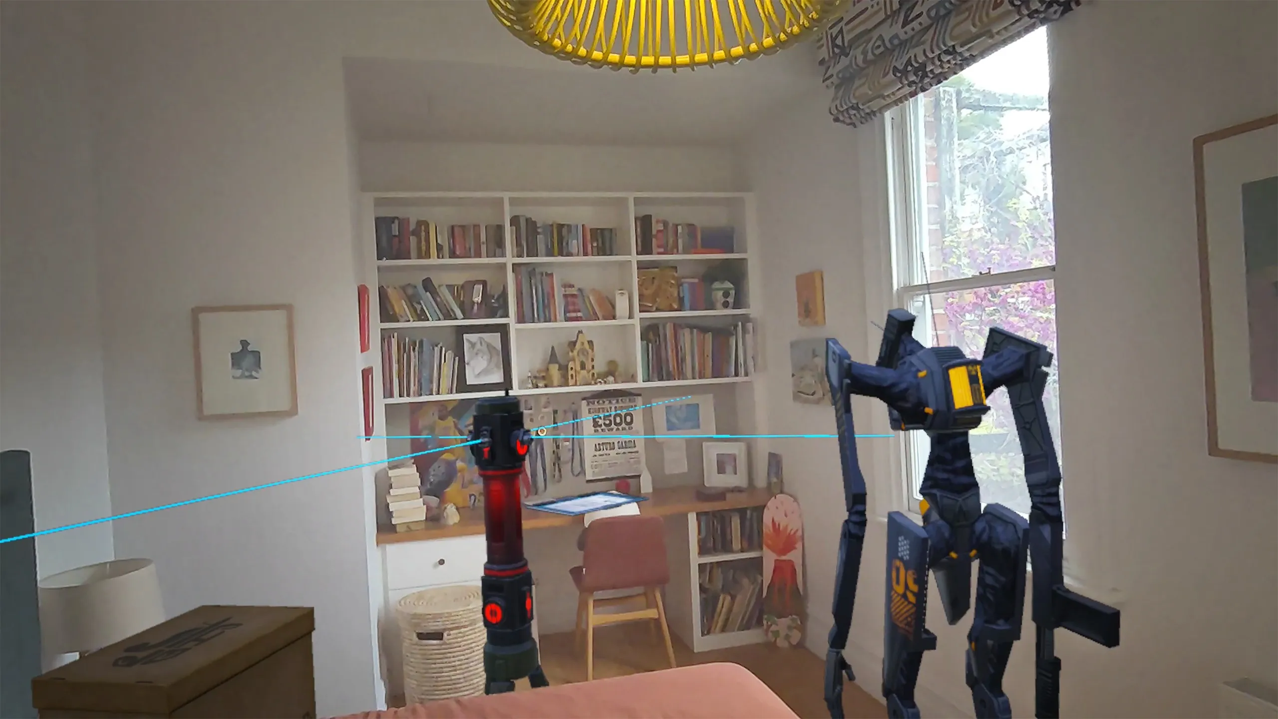 現実空間と仮想空間の境界を越えて警備兵と交戦します。警備兵はあなたの実際のソファの後ろに隠れて応戦してきます。