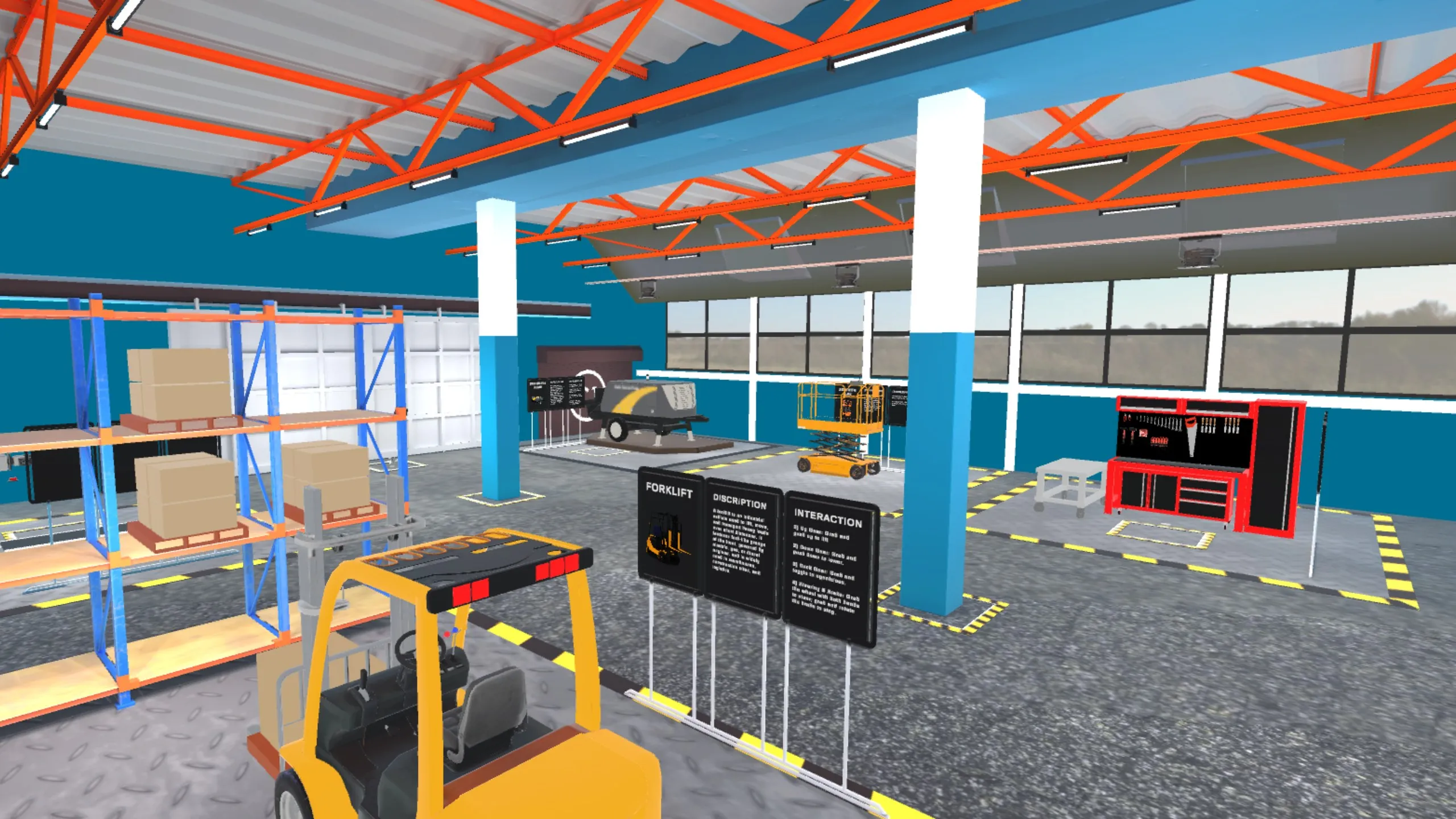 コントローラーなしで現実世界の機械を探索し対話することができる製造シミュレーションに足を運んでください。 シザーリフトとフォークリフトの操作からツールボックス、ロボットアーム、コンクリートポンプの点検まで、それぞれの相互作用がVRハンドトラッキングの精度と直感性を強調するように設計されています。