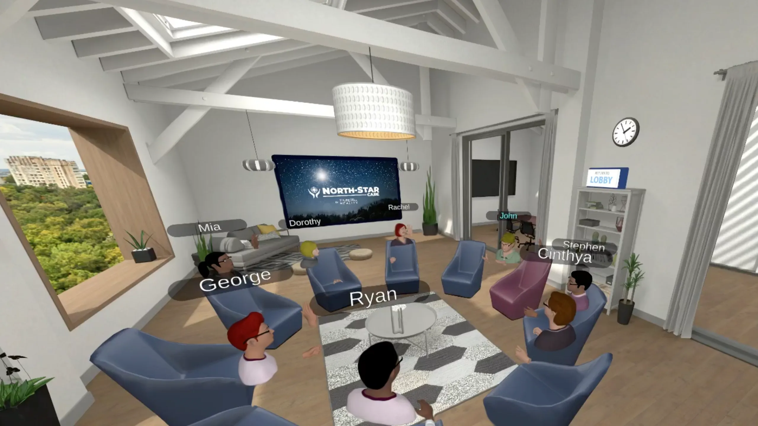 NorthStar Care VRアプリケーションは、グループディスカッション、ヨガ、瞑想、その他のマインドフルネス実践といった支援的な活動を通じて、判断力なく人間のつながりを育む安全なピア交流を可能にします。
