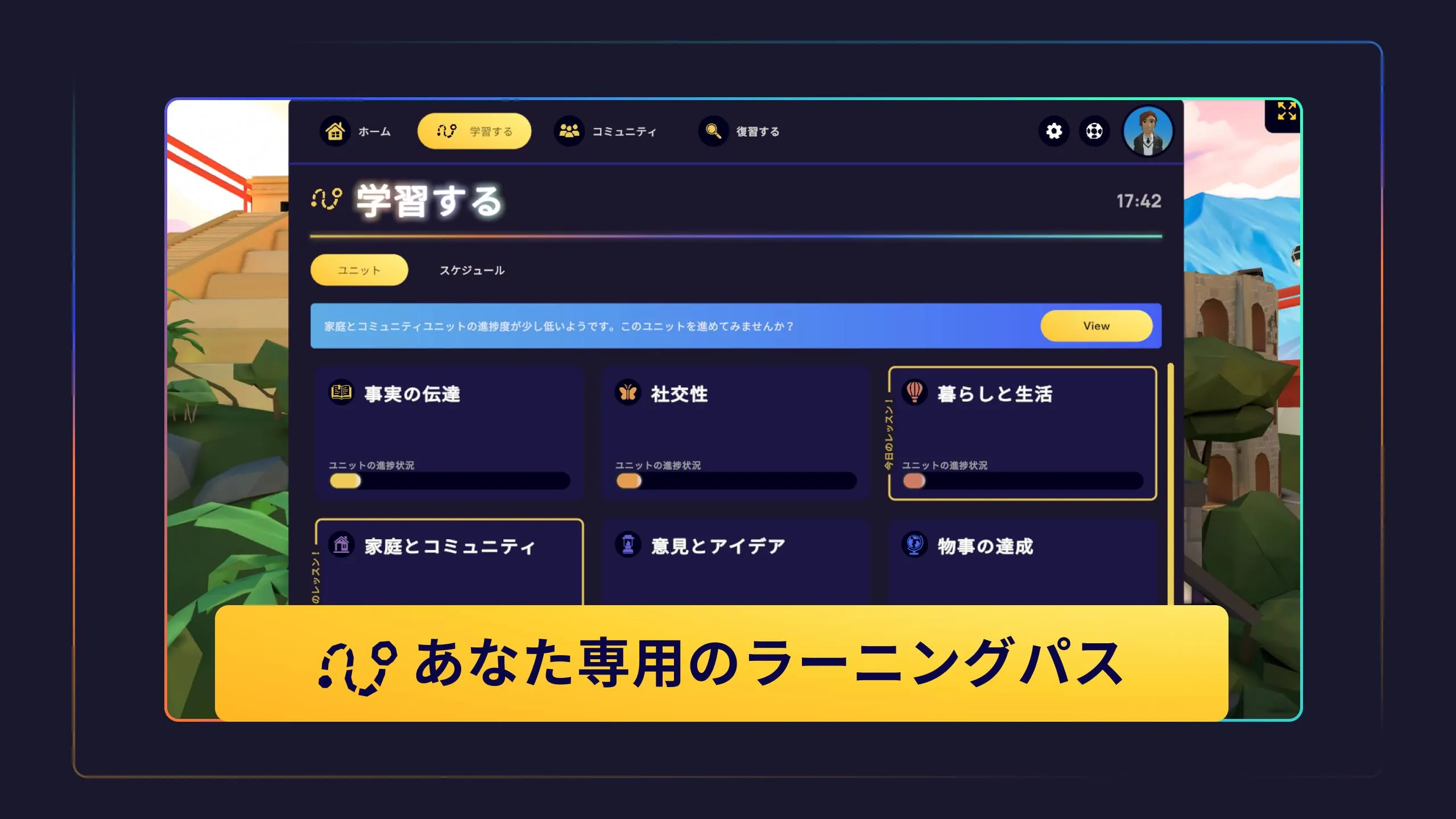 言語を習得するのに必要な9つの学習カテゴリーで自分の学習進捗を見える化することで、自分の学習進捗を確認し、どこまで進んだか、何が足りないかを常に確認することができます。