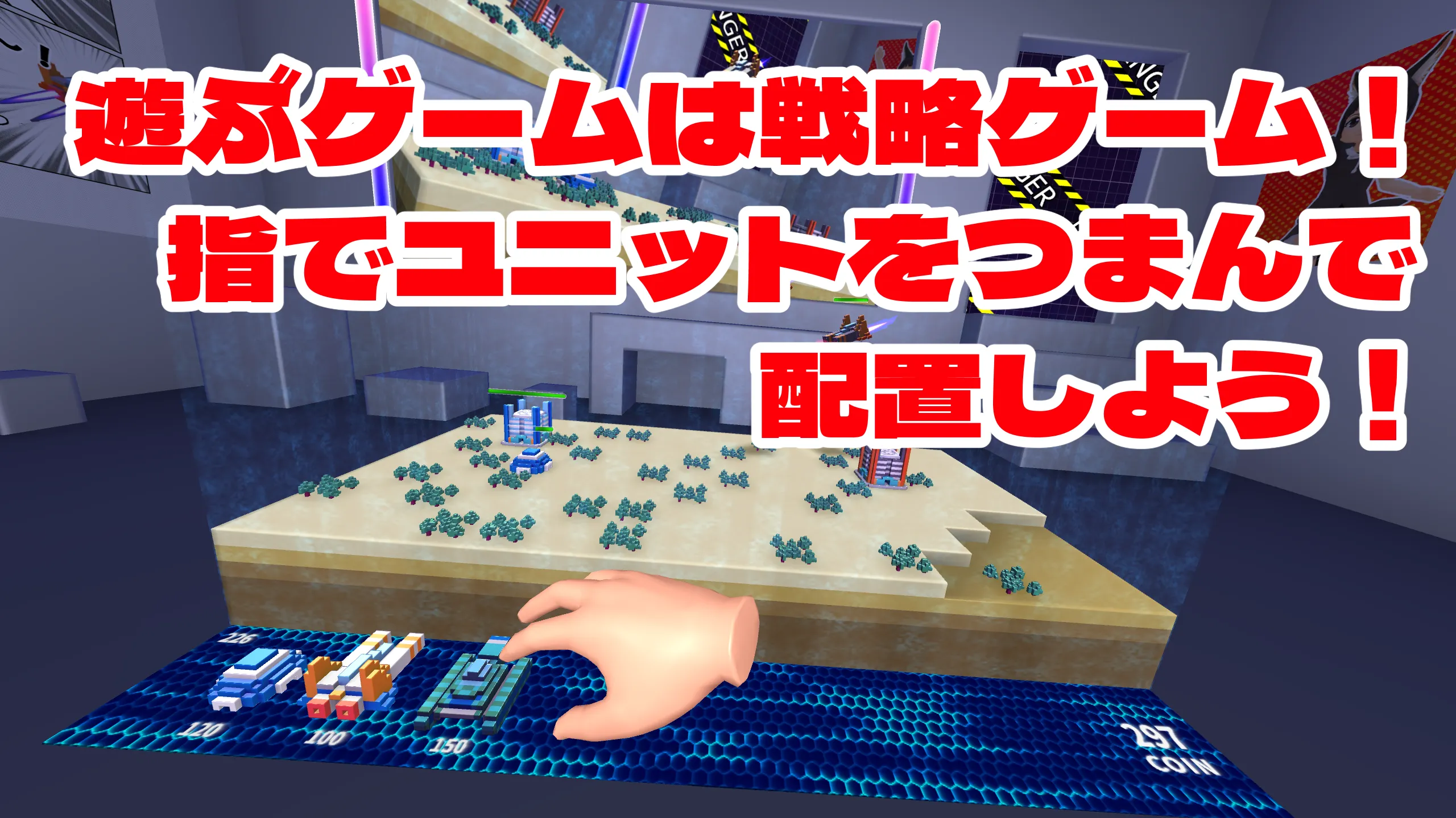 戦略ゲームで遊ぶので、ユニットを指でつまんでマップ上に配置していきます。