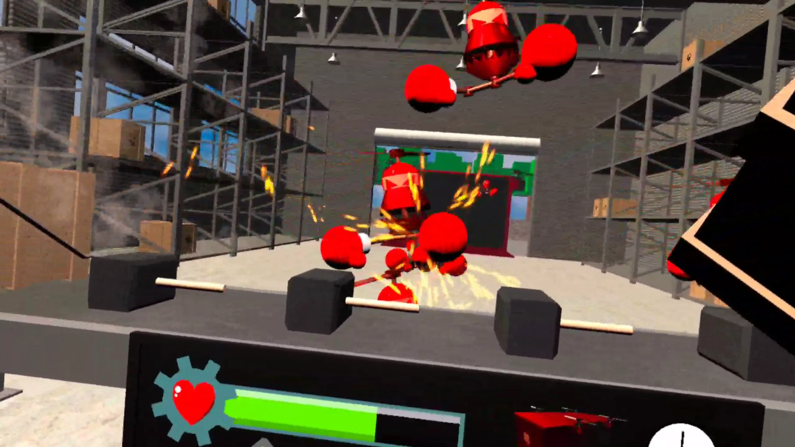工場の様々な種類のハンマーを投げてロボの波から防御しよう!