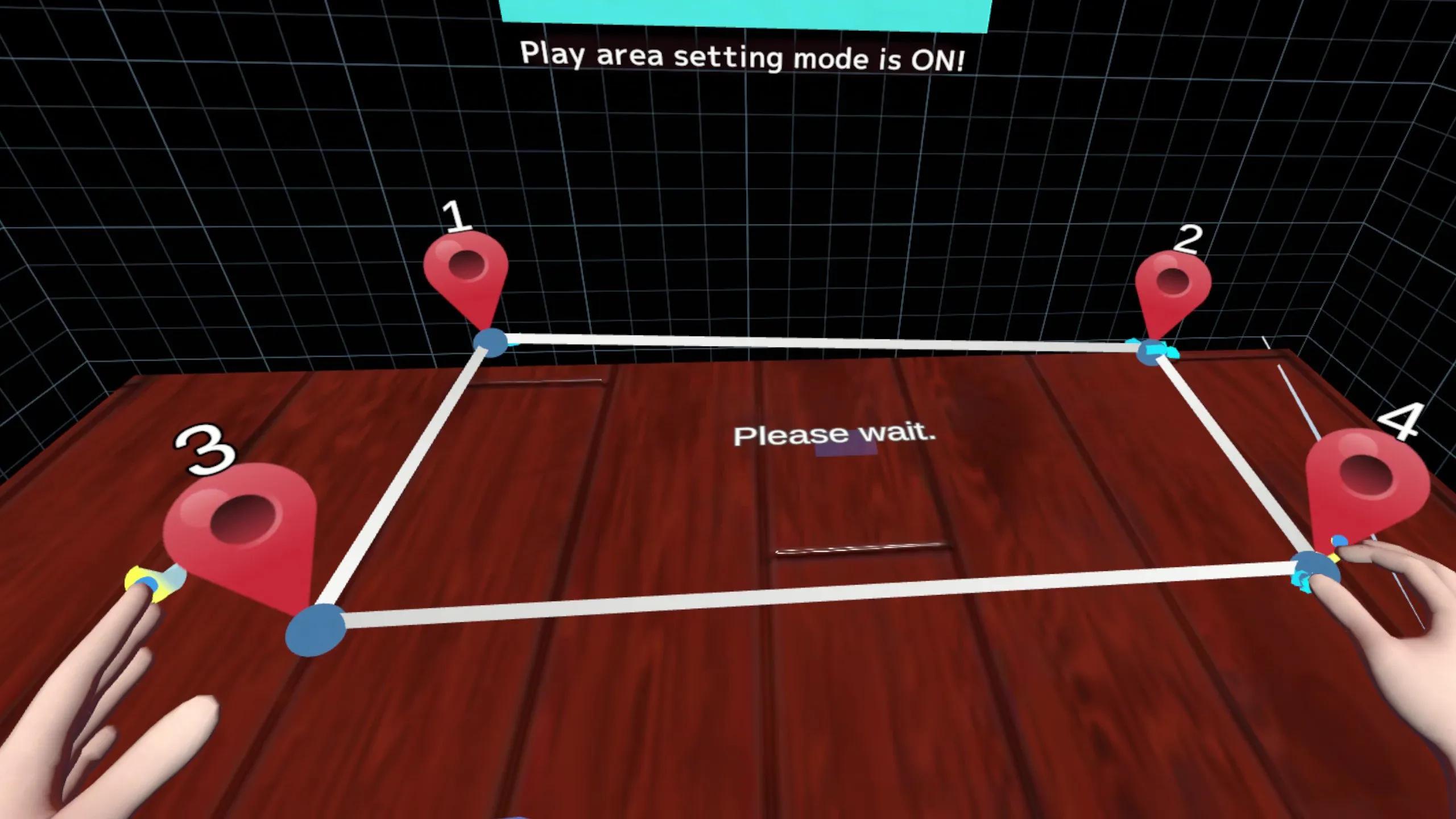 ・【初回のみ】説明が終わると、一時的にパススルーがONになります。その間に、現実世界で目の前にある「机」と重なるように、3Dコントローラー(Vessk)を生成します。