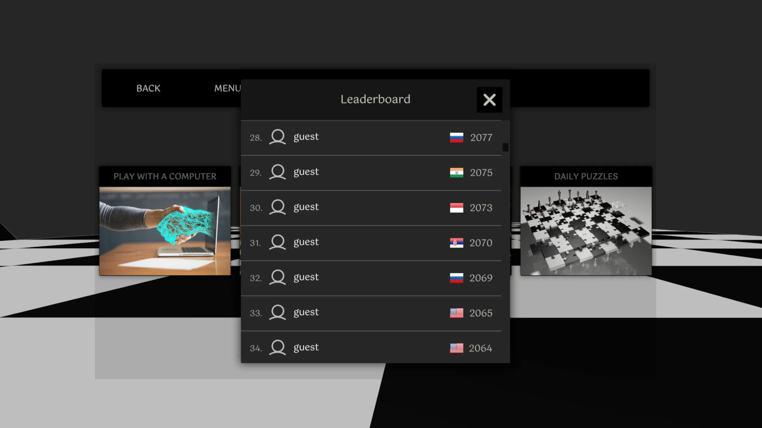美しいVR環境で、オンラインまたはコンピューターに対してランダムな人と友達とチェスをプレイしよう。