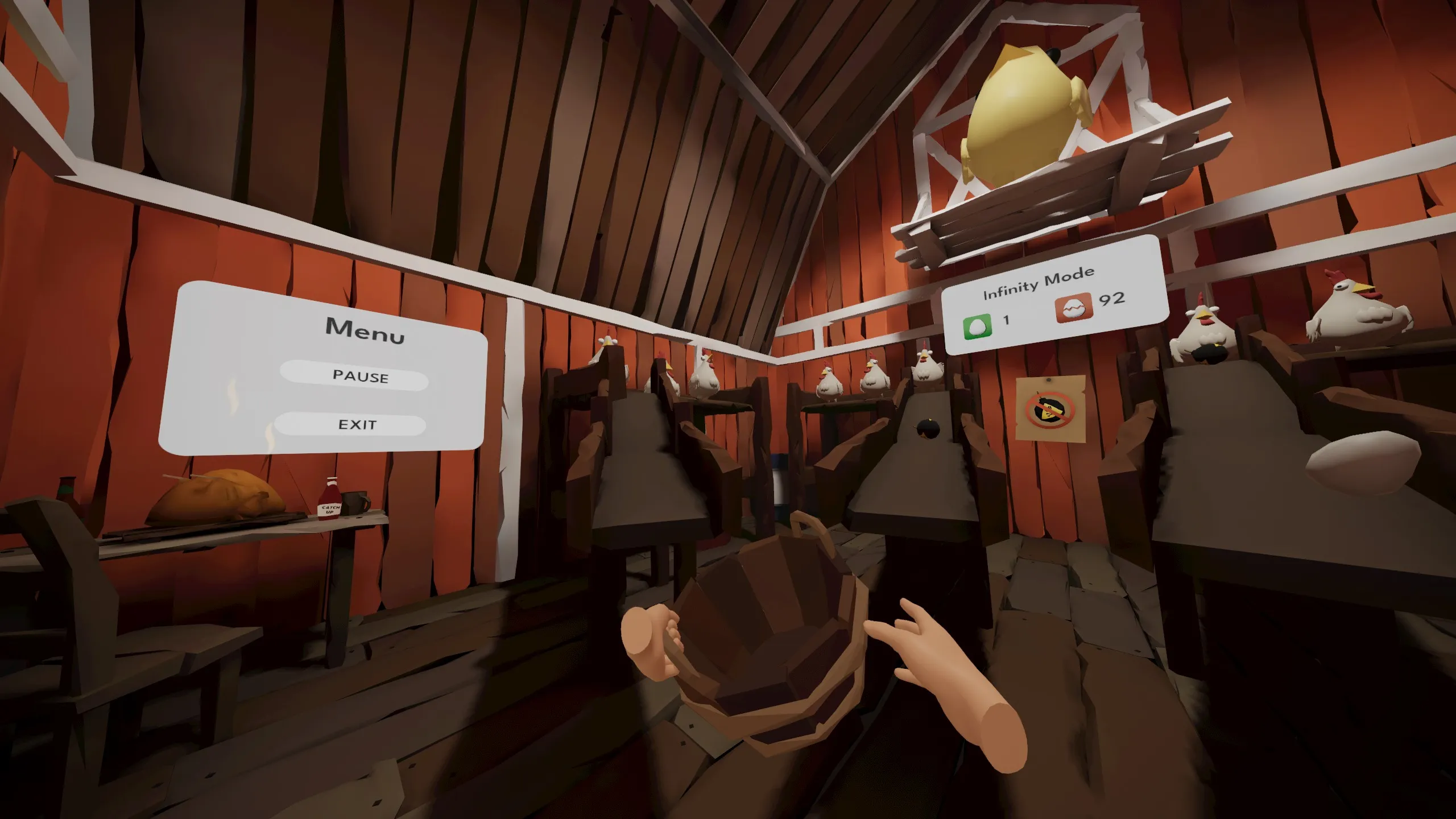 キャッチアップは、農家としてプレイするカジュアルなバーチャルリアリティアーケードゲームです。かごに入った卵を捕まえて負けないことが主な目標です。
