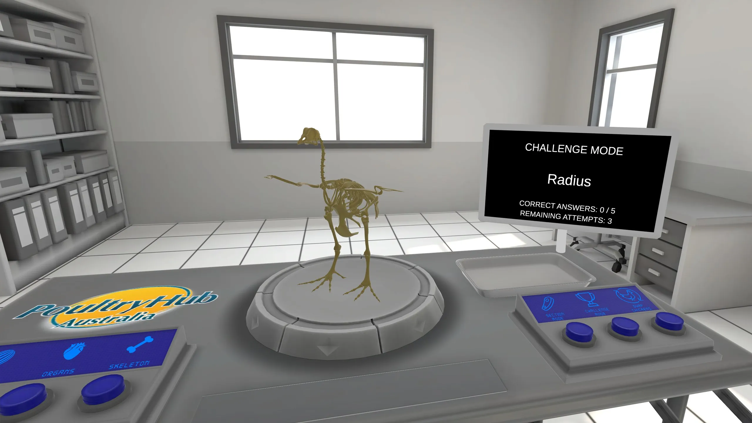 鶏の解剖学の探求後に、チャレンジモードで鶏の部位についての知識をテストすることができます。 チャレンジモードでは、本物の解剖のようにピンセットを使って鶏肉から指名された部分を抽出するユーザーを巻き込むことで知識をテストします。 フィードバックは、ユーザーが解剖トレイに部分を置くと自動的に提供されます。