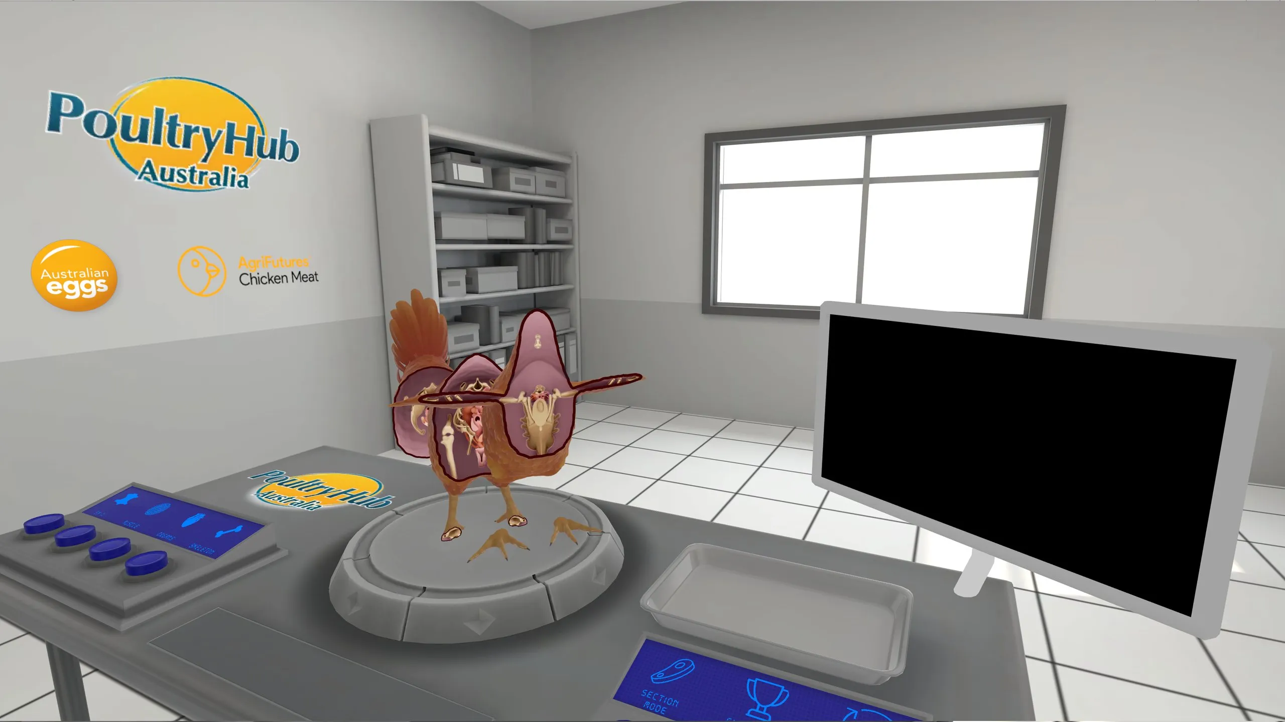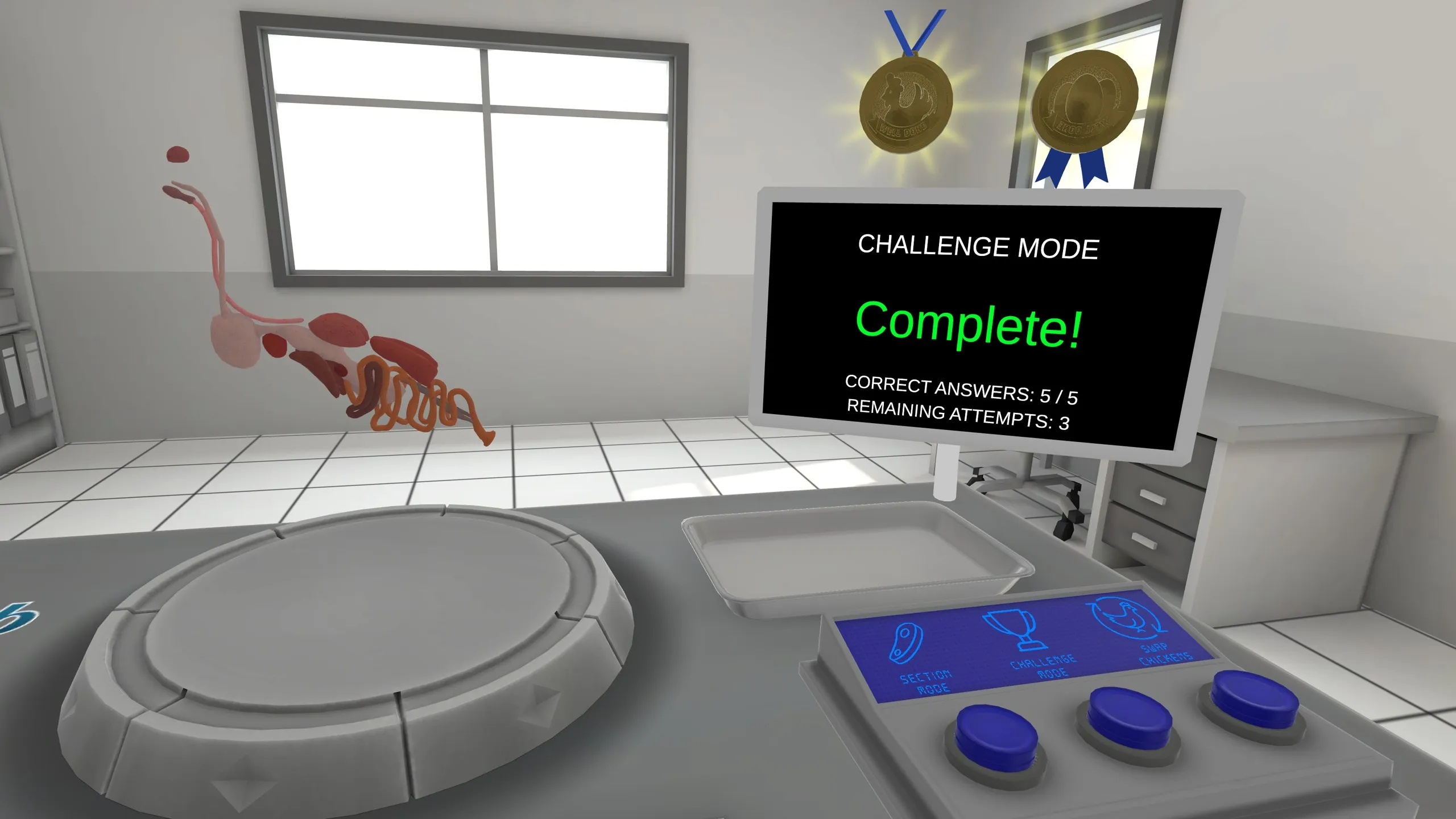 鶏の解剖学の探求後に、チャレンジモードで鶏の部位についての知識をテストすることができます。 チャレンジモードでは、本物の解剖のようにピンセットを使って鶏肉から指名された部分を抽出するユーザーを巻き込むことで知識をテストします。 フィードバックは、ユーザーが解剖トレイに部分を置くと自動的に提供されます。
