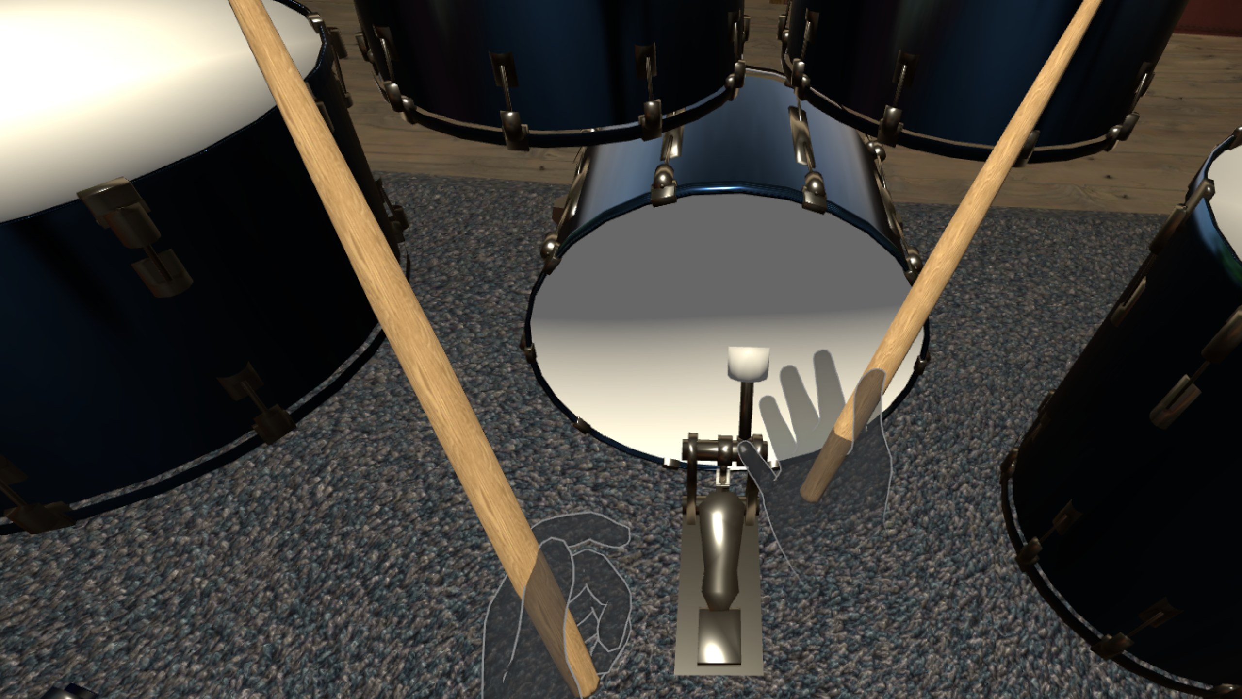 ハイハットとバスドラムを使用するには、単に手を開き、それぞれの手でジェスチャーをトリガーします。そして、究極のリアリティを追求する場合は、実際のドラムスティックを持って演奏することさえできます。