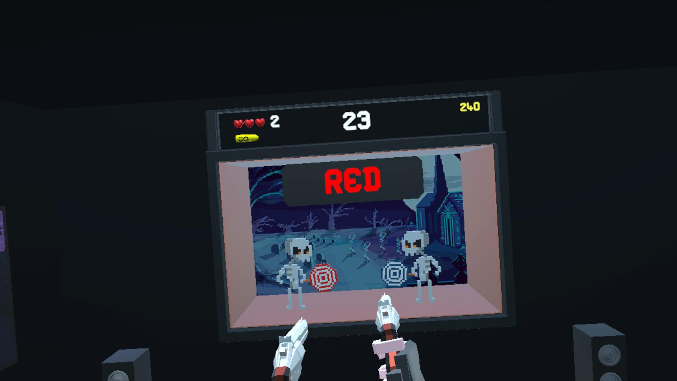 すべてのターゲットは非暴力的で、ピクセルアートの漫画デザインを持っています。 それぞれのステージは異なる目的を持っている、各ステージの開始時に説明される。 単純なターゲット射撃(爆弾回避)から悪役射撃(民間人を撃つのを避ける)、あるいは特定の色のターゲットを撃つなどに変わる。