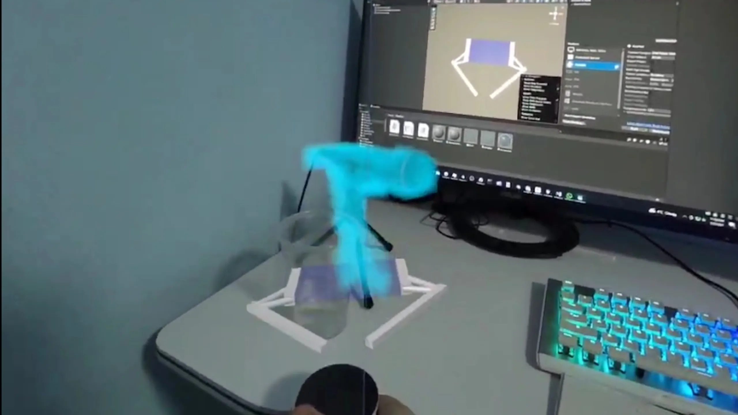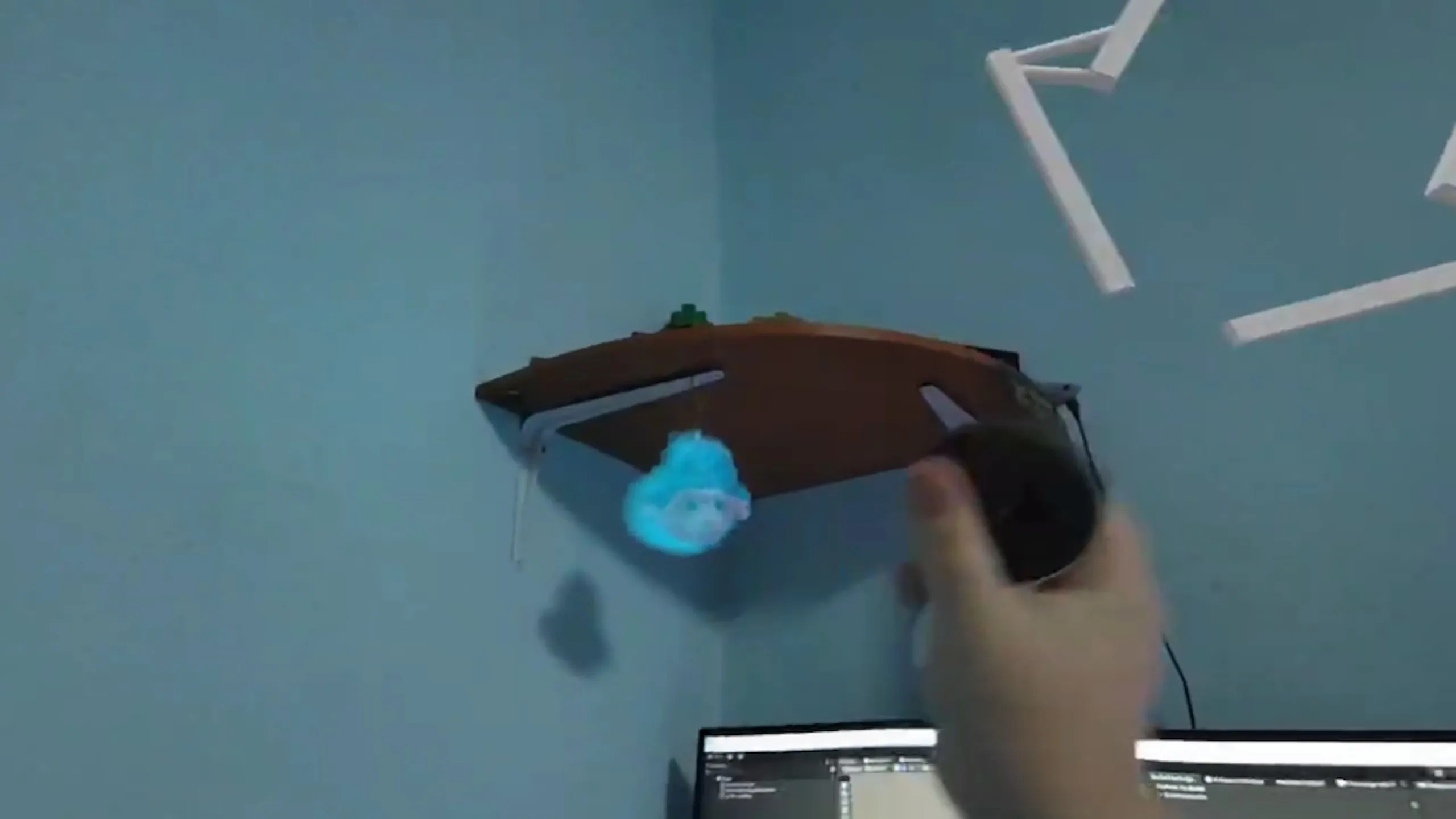この問題のある最適化の欠如に加えて、ノベルティが消えるとコントロールは厄介です。 何かをスキャンするなら、ヘッドセットはフロントセンサーから深度データを取得するのに、手持ちの「スキャナー」で「スキャン」しないといけない。 小物やルームスキャニングには妥当な設計(「無限範囲」モードを使う、どうやって起動したのかわからない)、ヘッドセットの即位置から深度データ全体が必要な私のユースケースには理不尽。