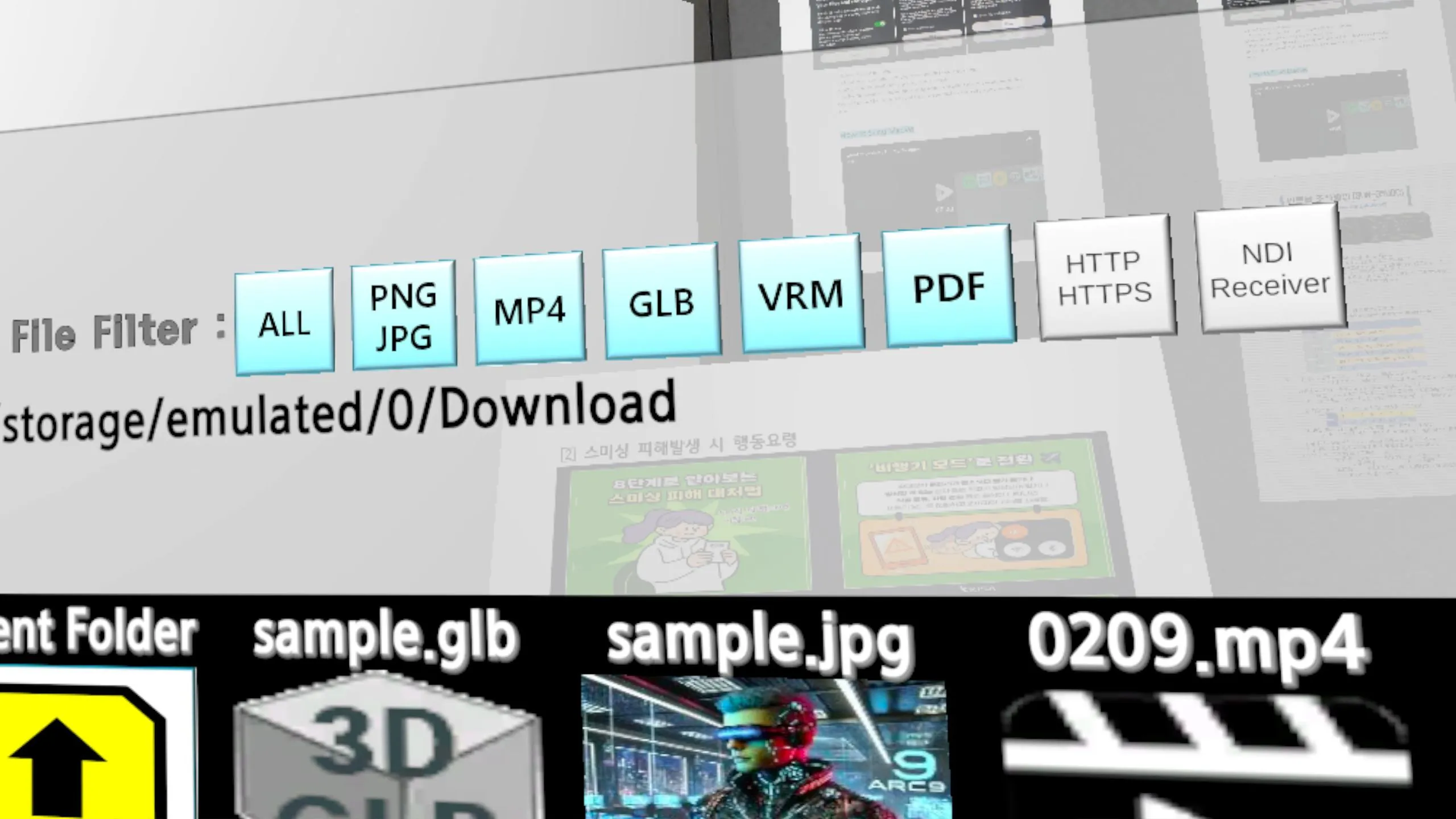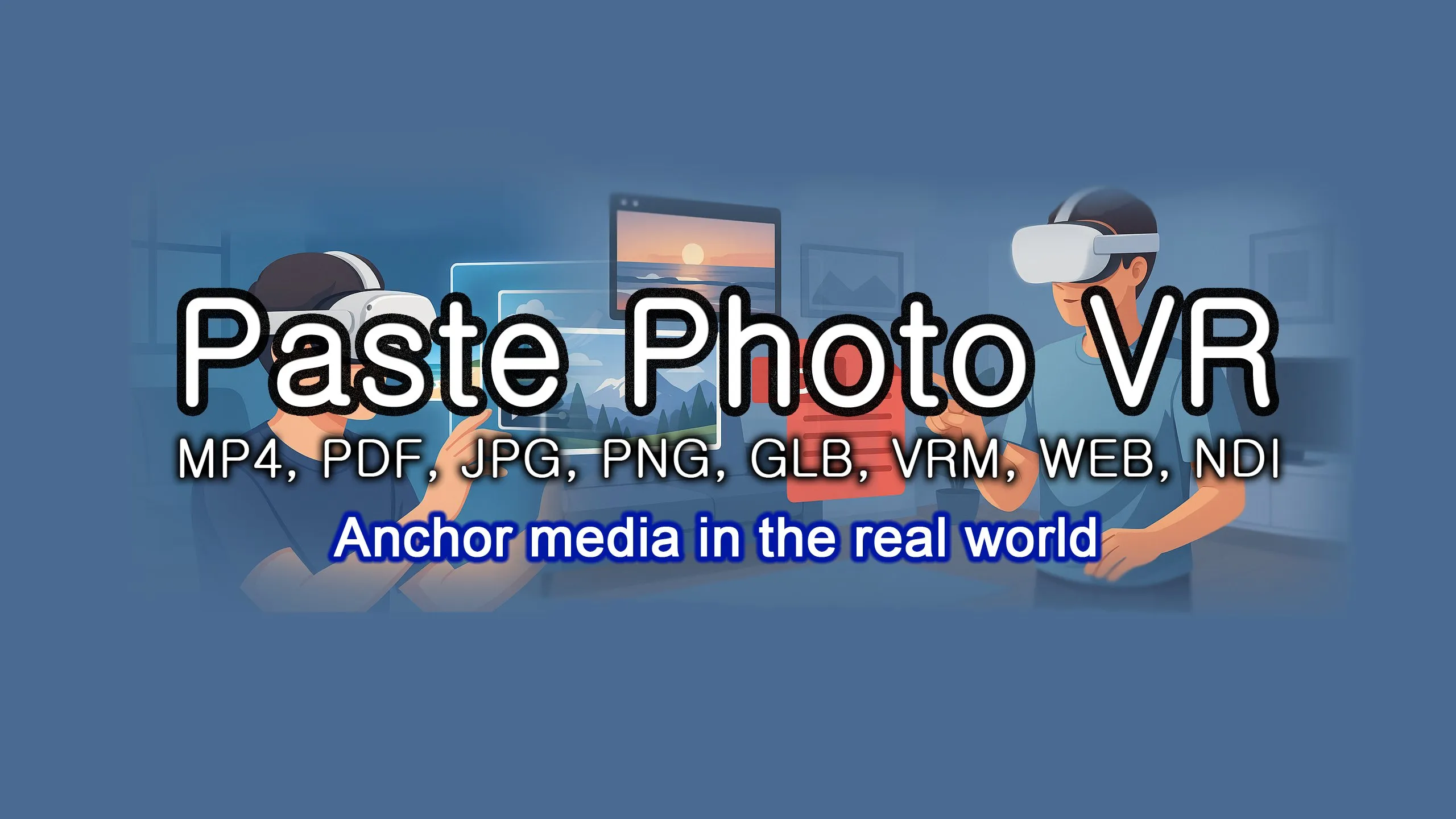 写真を空間的に貼り付けよう。 サポートされているファイルフォーマットは、MP4、PDF、JPG、PNG、GLB、VRM、WEB、NDIで、デバイス内のファイルを空間的に配置します。