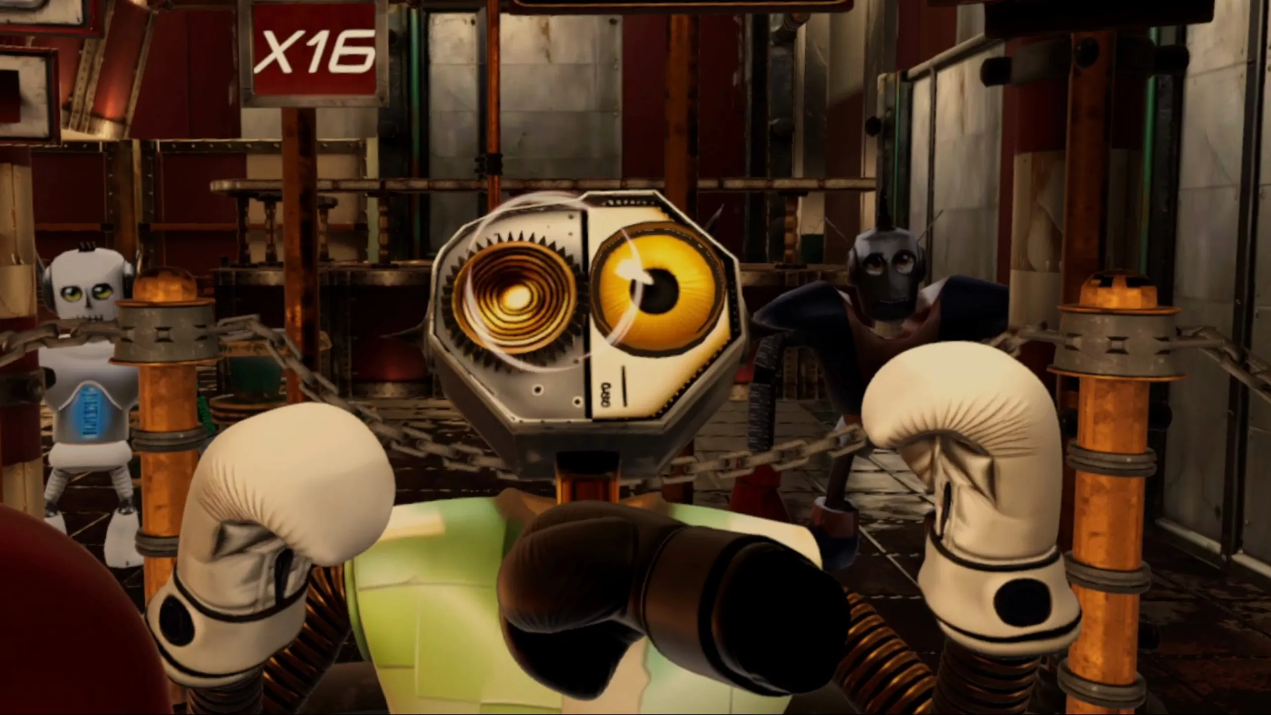 アと蒸気のジムでロボットを打ち砕け!スパーリングモードで自由に戦うか、リズムモードでビートに合わせてパンチし、王座を勝ち取れ!