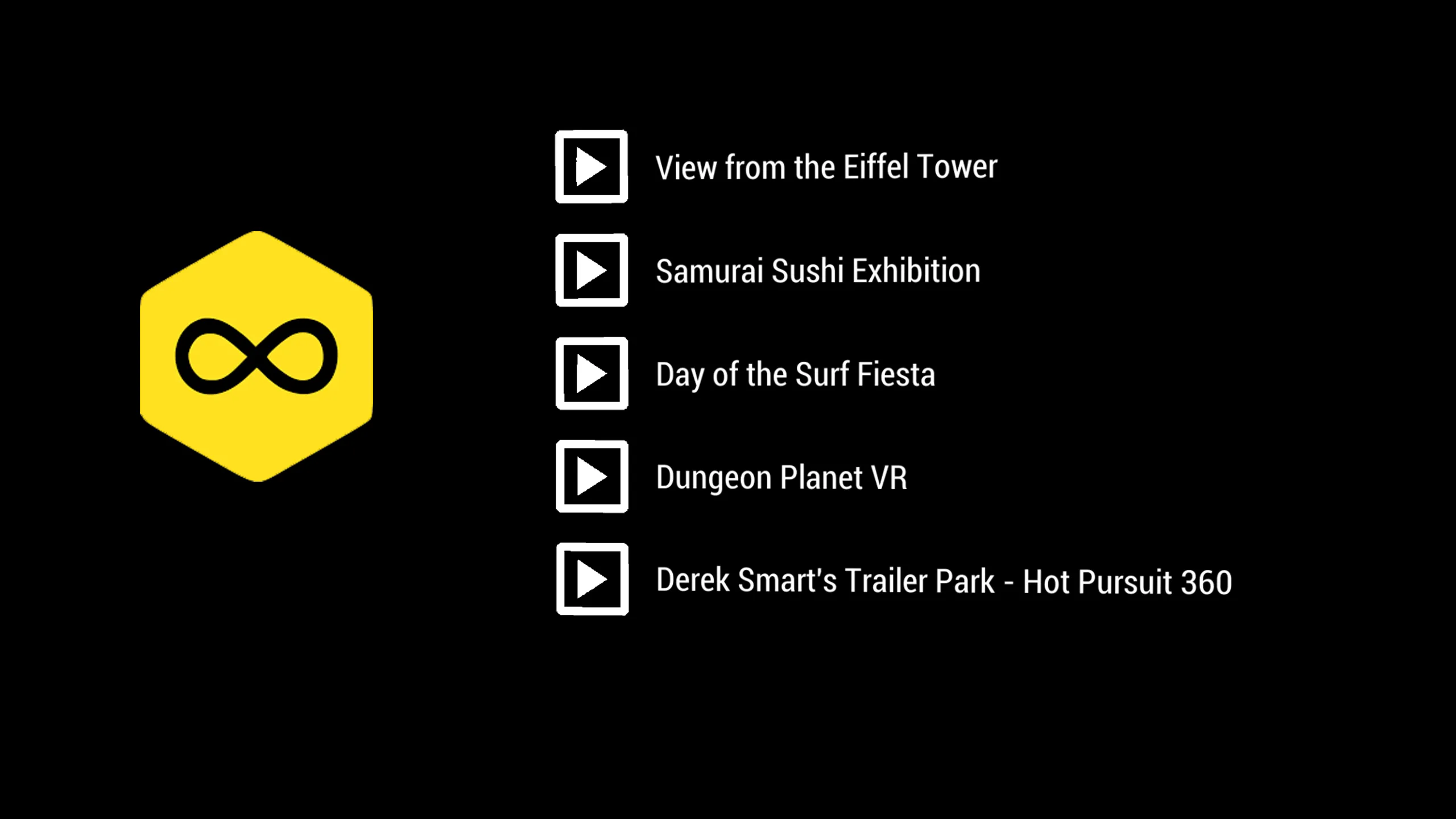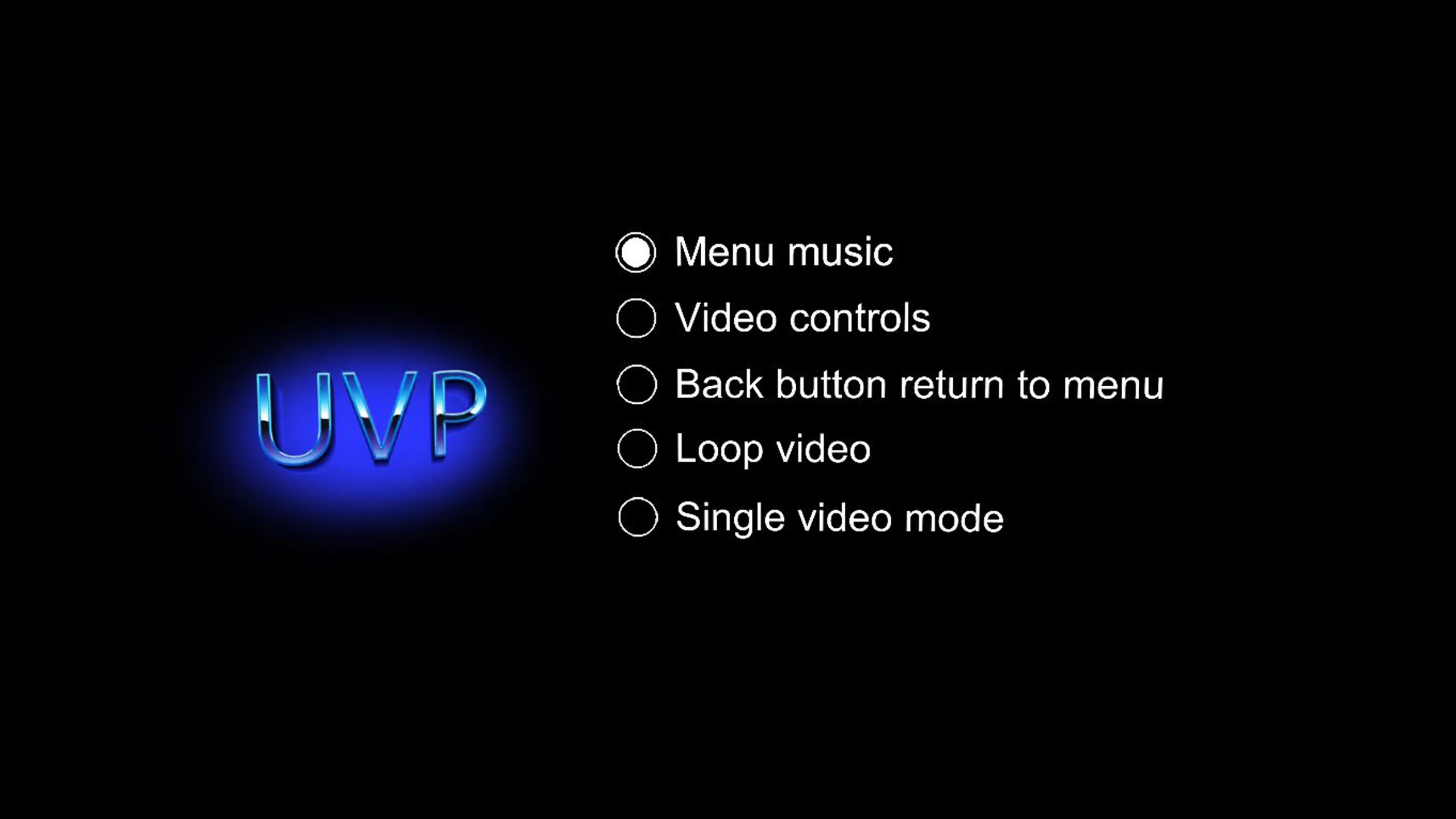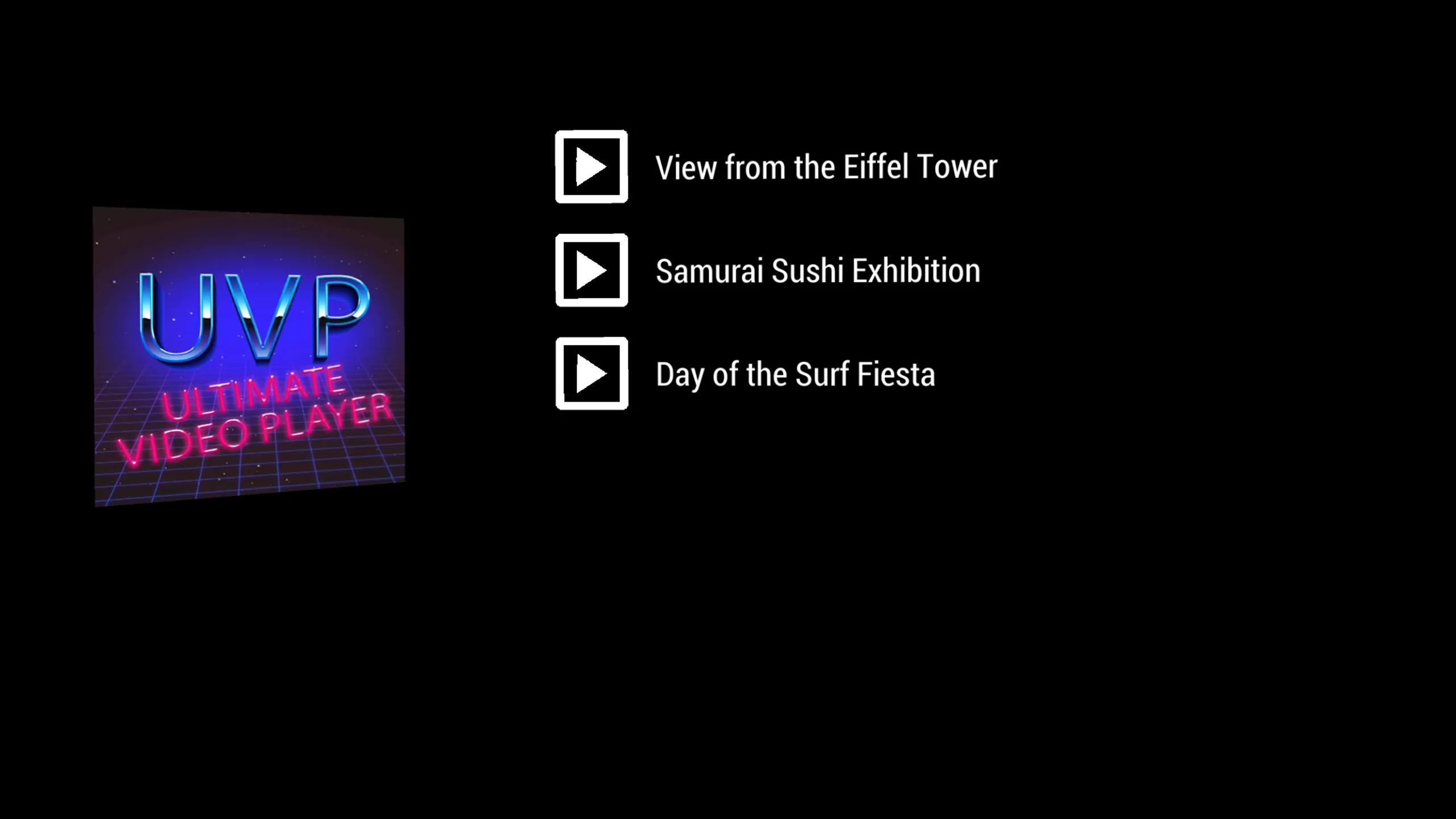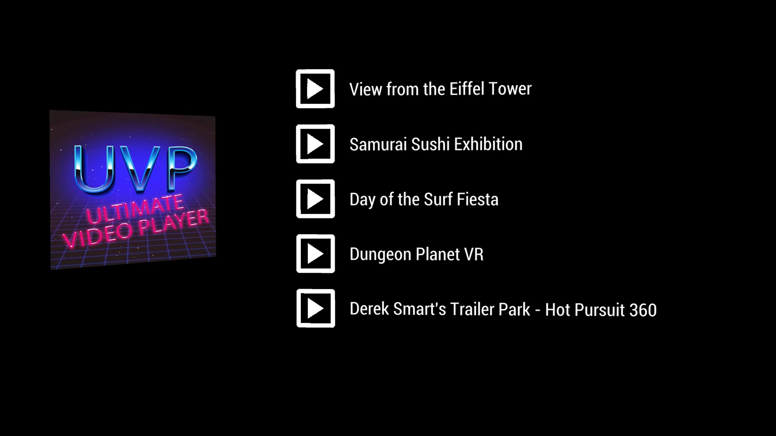 360と3D 360(TB)の動画に対応 イベントやプレゼンテーションに最適。 アプリがインストールされたら、一度起動してから再起動します。 これにより、フォルダ "C:\Users\&USERNAME&\Documents\UVP"の下にフォルダ構造が "Sounds""", "Videos", "Images"""で生成されます。 最新: -ロゴを指している間にトリガーを引くことでアクセス可能な隠し設定メニュー。 次の内容が含まれます: *メニュー音楽の無効/有効 *動画コントロール無効/有能 *バックボタン無効/無効 *ループ動画無効/有効果 *アプリをシングルビデオモードに設定(メニューをスキップし、アプリ起動時に自動再生) 前: -フォルダ「Sounds」にaudio.wav」という名前の音声ファイルを追加することで、独自の音声を追加できます。 -アプリに大量の動画を追加している人は、トラックパッドを使ってリストをスクロールすることができます。 -360度動画を「動画」フォルダに追加 3D 360ビデオの場合は、ファイル名にTBを追加してください。 -ロゴを追加したい場合は、画像ファイルに「Logo.png」と名前をつけて「画像」フォルダに入れてください。