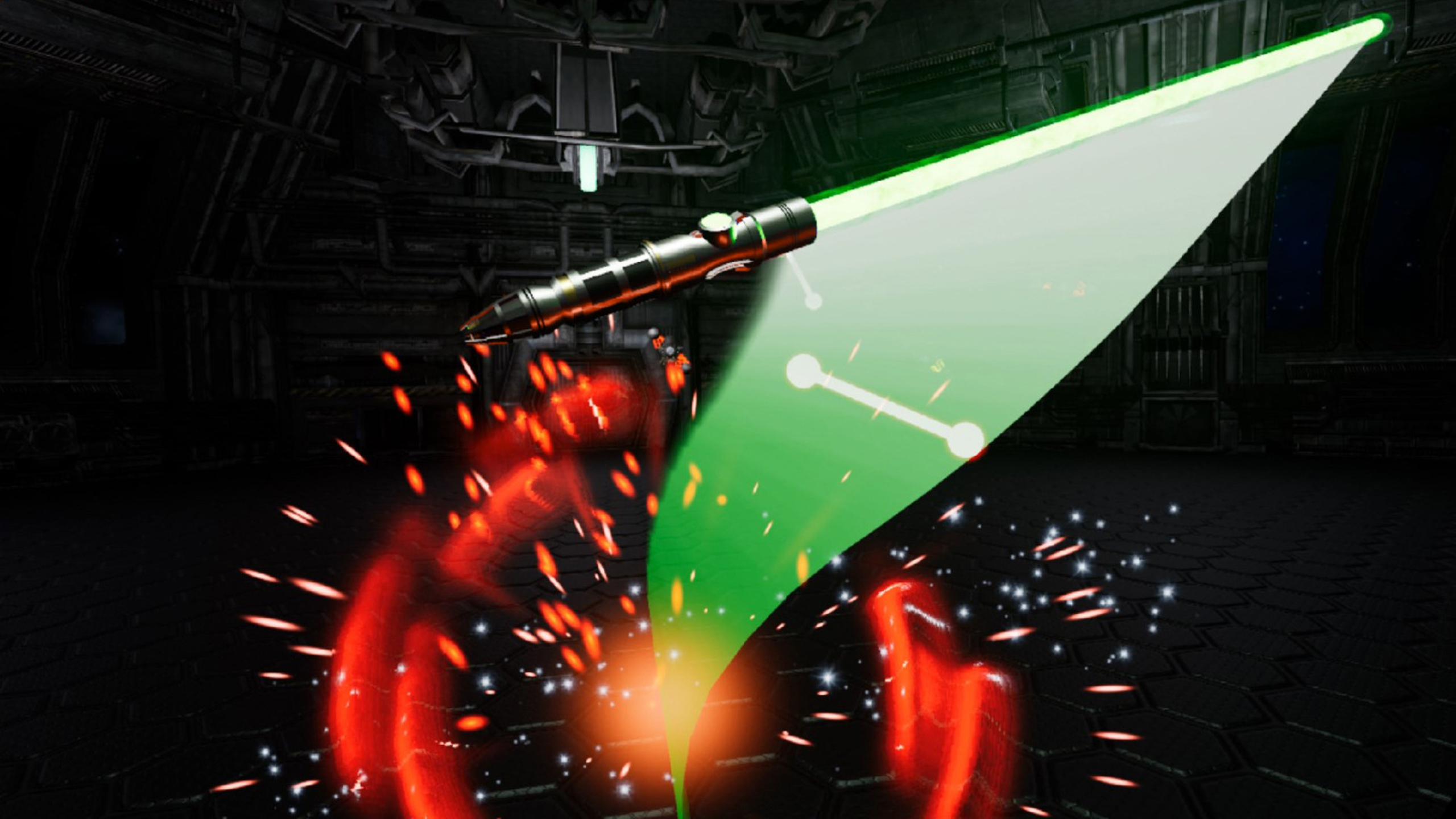 リズムゲームみたいだけど、リズムなし。 代わりに、ペースはランダムに瞬間瞬間に変動し、ほとんどのビームをどちらの手で破壊し、チャンスが訪れたら火を返し、それらのビームを発射するドローンを外すことは自由です! ブラスターボルトを反射して、激しい戦いに挑む!