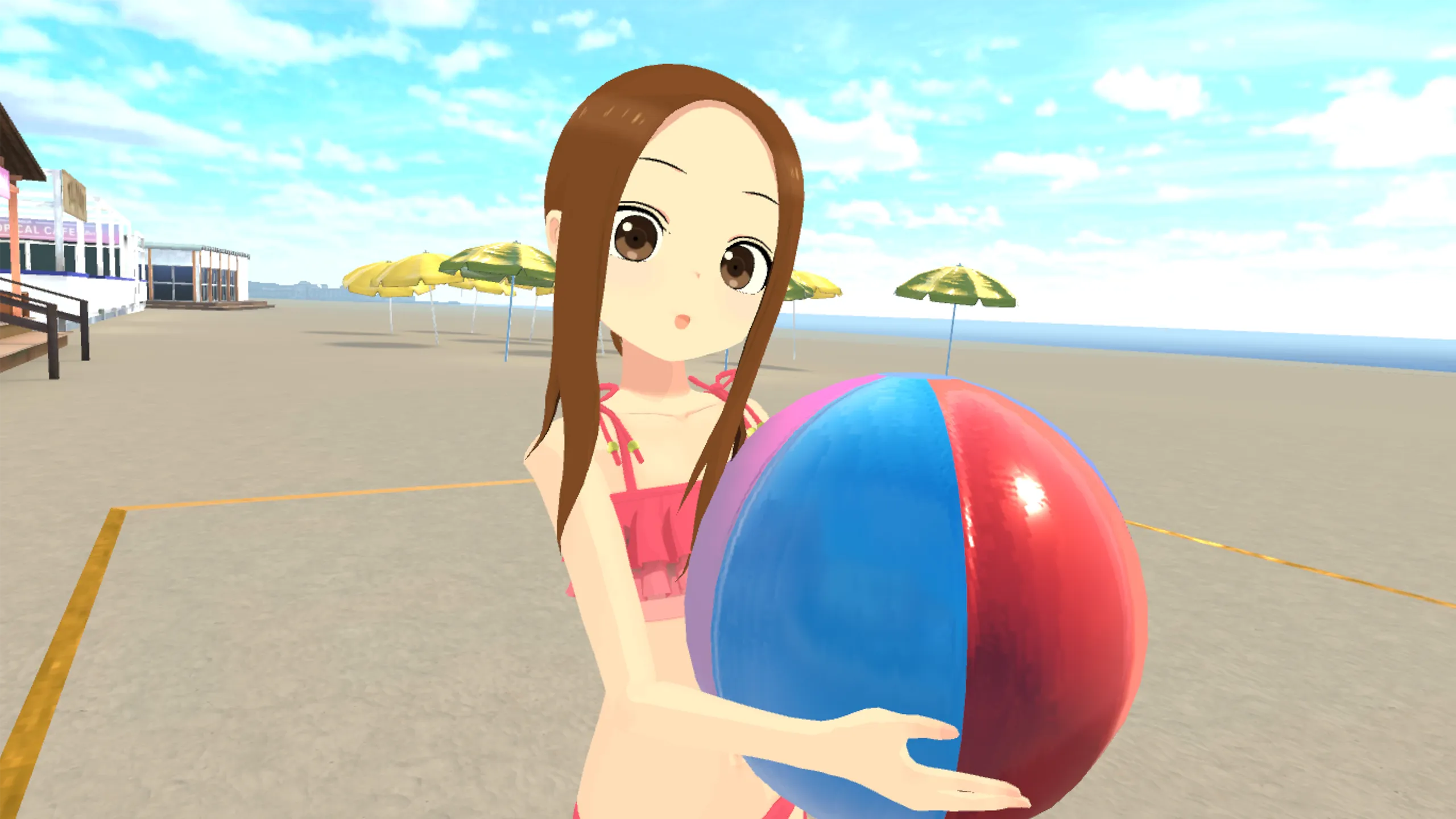 VR空間上で放課後の教室で高木さんと一緒に居残り掃除をしたり、海でビーチボールで遊んだり、など、